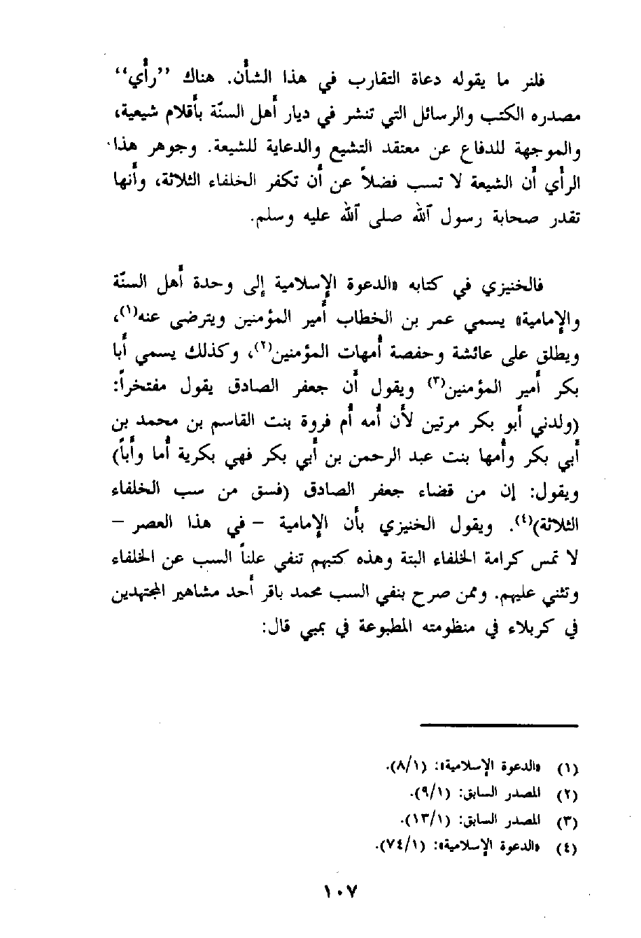 فالخنيزي في كتابه «الدعوة الإسلامية إلى وحدة أهل السنّة والإمامية» يسمي عمر بن الخطاب أمير المؤمنين ويترضى عنه (¬1) ، ويطلق على عائشة وحفصة أمهات المؤمنين (¬2) ، وكذلك يسمي أبا بكر أمير المؤمنين (¬3) ، ويقول أن جعفر الصادق يقول مفتخراً: (ولدني أبو بكر مرتين؛ لأن أمه أم فروة بنت القاسم بن محمد بن أبي بكر وأمها بنت عبد الرحمن بن أبي بكر، فهي بكرية أُماً وأباً) ، ويقول: إن من قضاء جعفر الصادق (فسق من سب الخلفاء الثلاثة) (¬4) . ويقول الخنيزي بأن الإمامية - في هذا العصر - لا تمس كرامة الخلفاء البتة وهذه كتبهم تنفي علناً السب عن الخلفاء وتثني عليهم. وممن صرح بنفي السب محمد باقر أحد مشاهير المجتهدين في كربلاء في منظومته المطبوعة في بمبي قال: