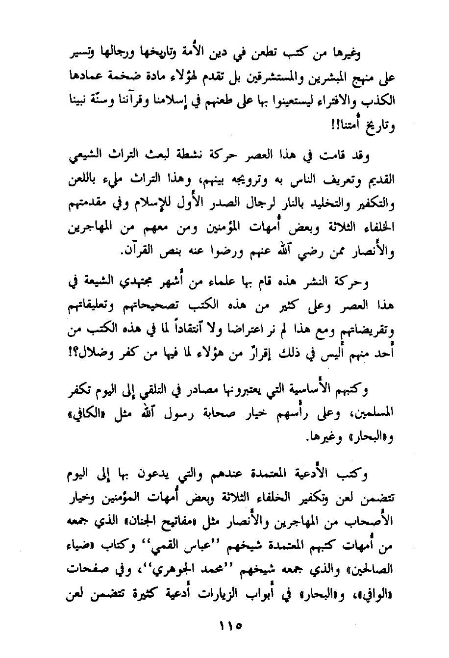 وقد قامت في هذا العصر حركة نشطة لبعث التراث الشيعي القديم وتعريف الناس به وترويجه بينهم، وهذا التراث مليء باللعن والتكفير والتخليد بالنار لرجال الصدر الأول للإسلام، وفي مقدمتهم الخلفاء الثلاثة وبعض أمهات المؤمنين ومن معهم من المهاجرين والأنصار ممن رضي الله عنهم ورضوا عنه بنص القرآن.