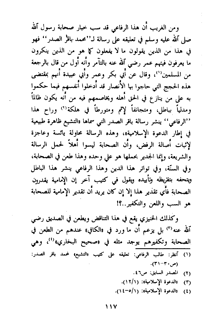 ومن الغريب أن هذا الرفاعي قد سب خيار صحابة رسول الله - صلى الله عليه وسلم - في تعليقه على رسالة لـ"محمد باقر الصدر"، فهو في هذا من الذين يقولون ما لا يفعلون كما هو من الذين ينكرون ما يعرفون، فيتهم عمر (بالتآمر وأنه أول من قال بالرجعة من المسلمين (¬1) ، وقال عن أبي بكر وعمر وأبي عبيدة أنهم بمقتضى هذه الحجج التي حاجوا بها الأنصار قد أدخلوا أنفسهم فيما حكموا به على من ينازع في الحق أهله ويخاصمهم فيه؛ من أنه يكون ظالماً ومدلياً بباطل، ومتجانفاً لإثم ومتورطاً في هلكة (¬2) . وراح هذا "الرفاعي" ينشر رسالة باقر الصدر التي سماها: «التشيع ظاهرة طبيعية في إطار الدعوة الإسلامية» ، وهذه الرسالة محاولة يائسة وعاجزة لإثبات أصالة الرفض، وأن الصحابة ليسوا أهلاً لحمل الرسالة والشريعة، وإنما الجدير بحملها هو علي وحده، وهذا طعن في الصحابة، وفي السنّة، وفي تواتر هذا الدين. وهذا الرفاعي ينشر هذا الباطل ويتحفه بتفريظه وتأييده، ويقول في كتيب آخر: إن الإمامية يقدرون الصحابة. فأي تقدير هذا إلا إن كان يريد أن تقدير الإمامية للصحابة هو السب واللعن والتكفير..؟!