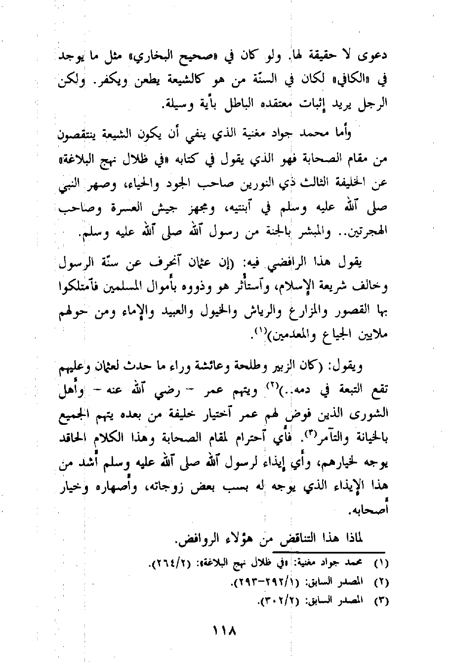 وأما محمد جواد مغنية - الذي ينفي أن يكون الشيعة ينتقصون من مقام الصحابة - فهو الذي يقول في كتابه «في ظلال نهج البلاغة» عن الخليفة الثالث ذي النورين - صاحب الجود والحياء، وصهر النبي - صلى الله عليه وسلم - في ابنتيه، ومجهز جيش العسرة وصاحب الهجرتين.. والمبشر بالجنة من رسول الله - صلى الله عليه وسلم - ـ يقول هذا الرافضي فيه: (إن عثمان انحرف عن سنّة الرسول وخالف شريعة الإسلام، واستأثر هو وذووه بأموال المسلمين فامتلكوا بها القصور والمزارع والرياش والخيول والعبيد والإماء ومن حولهم ملايين الجياع والمعدمين) (¬1) .