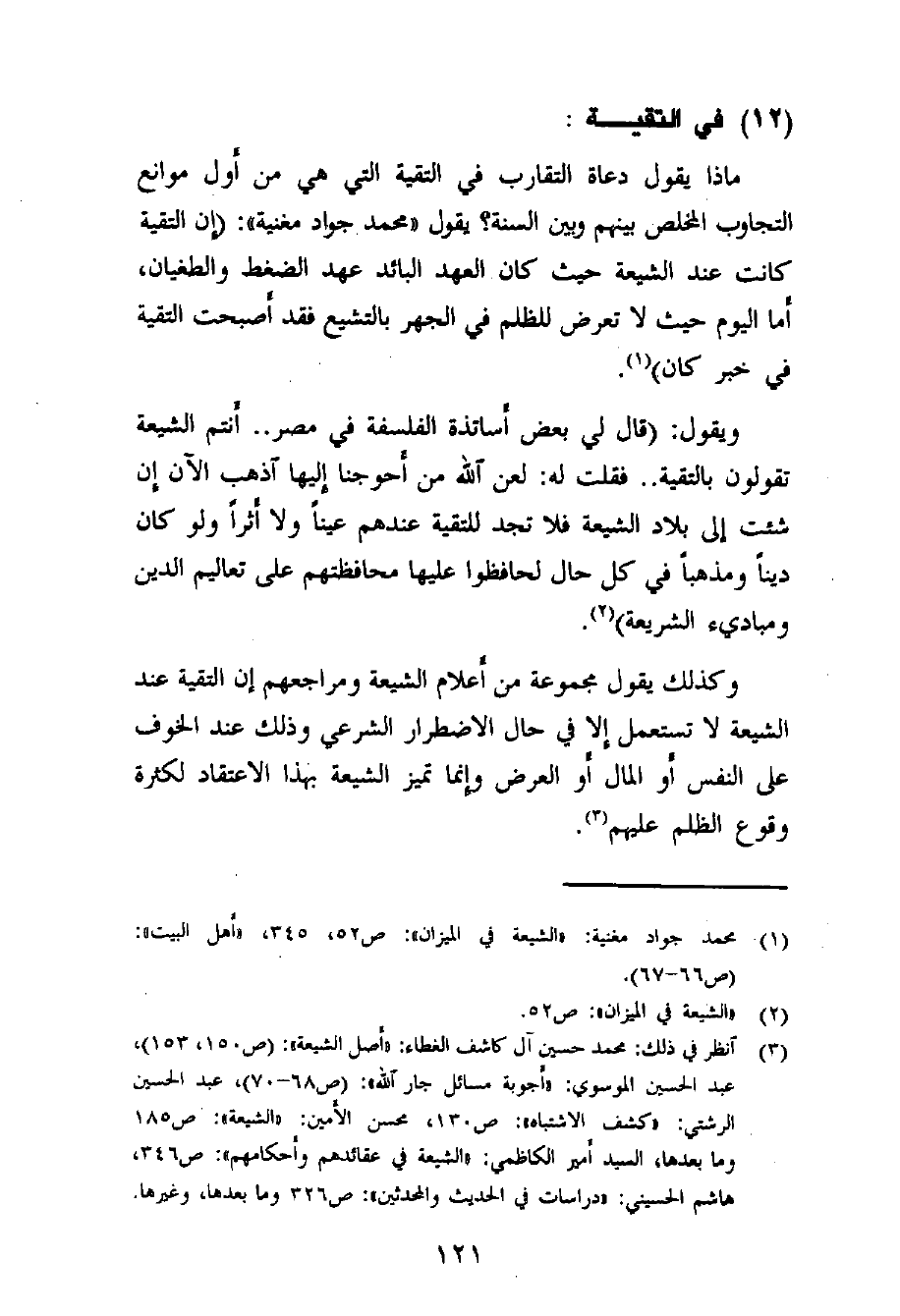 ماذا يقول دعاة التقارب في التقية التي هي من أول موانع التجاوب المخلص بينهم وبين السنة؟ يقول «محمد جواد مغنية» : (إن التقية كانت عند الشيعة حيث كان العهد البائد عهد الضغط والطغيان، أما اليوم حيث لا تعرض للظلم في الجهر بالتشيع، فقد أصبحت التقية في خبر كان) (¬1) .