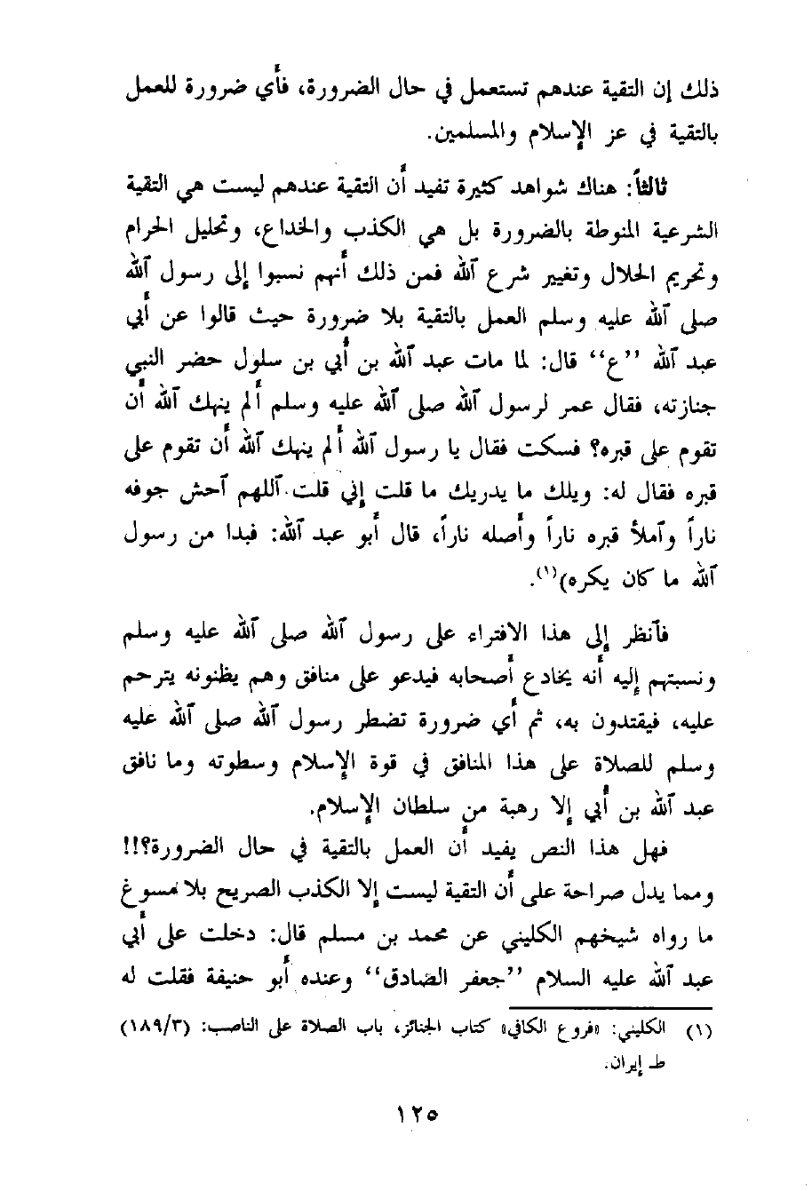 ثالثاً: هناك شواهد كثيرة تفيد أن التقية عندهم ليست هي التقية الشرعية المنوطة بالضرورة، بل هي الكذب والخداع، وتحليل الحرام وتحريم الحلال وتغيير شرع الله، فمن ذلك أنهم نسبوا إلى رسول الله - صلى الله عليه وسلم - العمل بالتقية بلا ضرورة حيث قالوا عن أبي عبد الله "ع" قال: لما مات عبد الله بن أبي سلول حضر النبي جنازته، فقال عمر لرسول الله - صلى الله عليه وسلم -: ألم ينهك الله أن تقوم على قبره؟ فسكت فقال: يا رسول الله ألم ينهك الله أن تقوم على قبره؟ فقال له: ويلك ما يدريك ما قلت، إني قلت: اللهم احش جوفه ناراً واملأ قبره ناراً وأصله ناراً، قال أبو عبد الله: فبدا من رسول الله ما كان يكره) (¬1) .