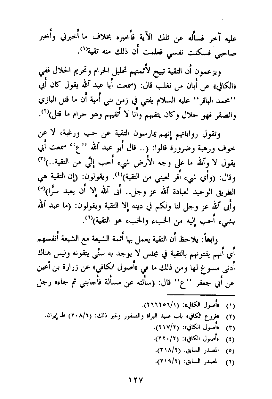 رابعاً: يلاحظ أن التقية يعمل بها أئمة الشيعة مع الشيعة أنفسهم، أي أنهم يفتونهم بالتقية في مجلس لا يوجد به سنّي يتقونه وليس هناك أدنى مسوغ لها، ومن ذلك ما في «أصول الكافي» عن زرارة بن أعين عن أبي جعفر "ع" قال: (سألته عن مسألة فأجابني ثم جاءه رجل