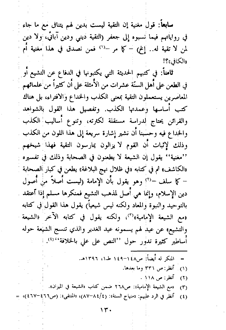ثامناً: في كتبهم الحديثة التي يكتبونها في الدفاع عن التشيع أو في الطعن على أهل السنّة عشرات من الأمثلة على أن كثيراً من علمائهم المعاصرين يستعملون التقية بمعنى الكذب والخداع والافتراء، بل هناك كتب أساسها وعمدتها الكذب. وتفصيل هذا القول بالشواهد والقرائن يحتاج لدراسة مستقلة لكثرته، وتنوع أساليب الكذب والخداع فيه، وحسبنا أن نشير إشارة سريعة إلى هذا اللون من الكذب وذلك لإثبات أن القوم لا يزالون يمارسون التقية؛ فهذا شيخهم "مغنية" يقول: إن الشيعة لا يطعنون في الصحابة، وذلك في تفسيره «الكاشف» ثم في كتابه «في ظلال نهج البلاغة» يطعن في كبار الصحابة - كما سلف - (¬2) وهو يقول بأن الإمامة (ليست أصلاً من أصول دين الإسلام، وإنما هي أصل لمذهب التشيع، فمنكرها مسلم إذا اعتقد بالتوحيد والنبوة والمعاد ولكنه ليس شيعياً) . يقول هذا القول في كتابه «مع الشيعة الإمامية» (¬3) ، ولكنه يقول في كتابه الآخر «الشيعة والتشيع» عن عيد لهم يسمونه عيد الغدير والذي تنسج الشيعة حوله أساطير كثيرة تدور حول "النص على علي بالخلافة" (¬4) .