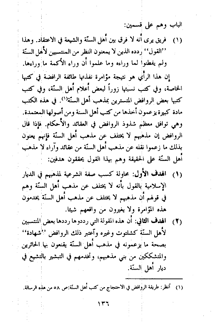 إن هذا الرأي هو نتيجة مؤامرة نفذتها طائفة الرافضة في كتبها الخاصة، وفي كتب نسبتها زوراً لبعض أعلام أهل السنّة، وفي كتب كتبها بعض الروافض المتسترين بمذهب أهل السنّة (¬1) ، وفي هذه الكتب مادة كبيرة يزعمون أخذها من كتب أهل السنّة ومن أصولها المعتمدة، وهي توافق معظم شذوذ الروافض في العقائد والأحكام. فإذا قال الروافض إن مذهبهم لا يختلف عن مذهب أهل السنّة فإنهم يعنون بذلك ما زعموا نقله عن مذهب أهل السنّة، من عقائد وآراء لا مذهب أهل السنّة على الحقيقة، وهم بهذا القول يحققون هدفين: