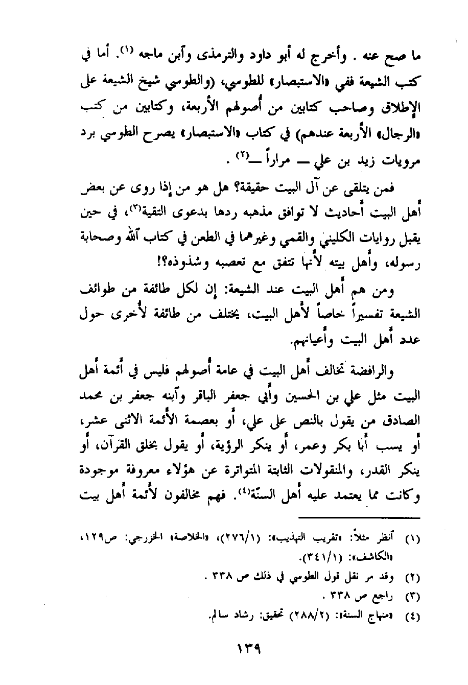ما صح عنه، وأخرج له أبو داود والترمذي وابن ماجه (¬1) . أما في كتب الشيعة ففي «الاستبصار» للطوسي، (والطوسي شيخ الشيعة على الإطلاق وصاحب كتابين من أصولهم الأربعة، وكتابين من كتب «الرجال» الأربعة عندهم) في كتاب «الاستبصار» يصرح الطوسي برد مرويات زيد بن علي - مراراً - (¬2) .