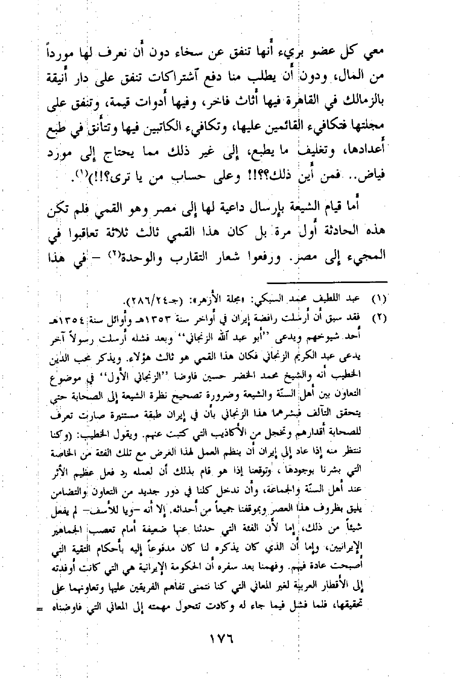 وقد اعترف أحد شيوخ الروافض بأن إنشاء دار التقريب كان عن سابق اتفاق من شيوخ الشيعة وقال: (ليس له - أي القمي - ولا لغيره من الناس أن يقوم بمثل هذا العمل من وراء المراجع ومن غير موافقتهم) (¬2) . إذن هي خطة مبيتة..، والغريب - فيما يبدو - أن هذا الأمر غير واضح عند بعض أعضاء الجماعة حتى خفي عليهم الجهة التي تمول "دار التقريب"، حتى قال أحد كبار أعضائها - بعد مضي أربع سنوات على إنشاء الدار ـ قال: (ورابني ويجب أن يرتاب