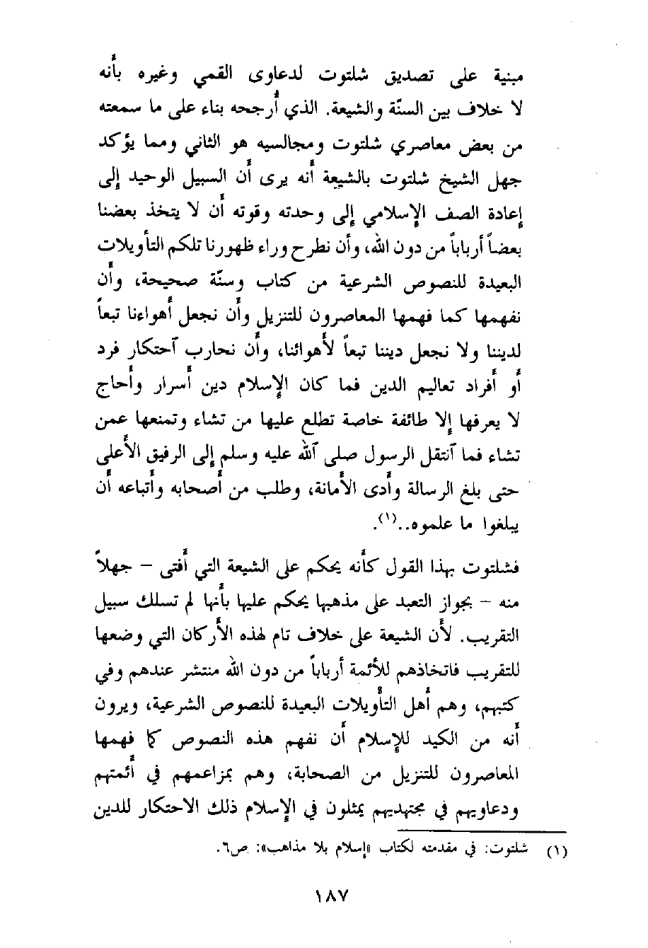 4- في كل دعوة للتقارب لا بد من البدء بالأصول قبل الفروع، ومن الغفلة أن يبدأ بدراسة الخلافات الفقهية بين السنّة والشيعة. والشيعة تشذ عن الأمة بكتبها في الحديث ورجالها، وأصولها، في مدلول القرآن ومفهوم السنّة، وفي حجية الإجماع. فأين الأصل الواحد الذي تناقش على ضوئه الخلافات الفقهية؟.