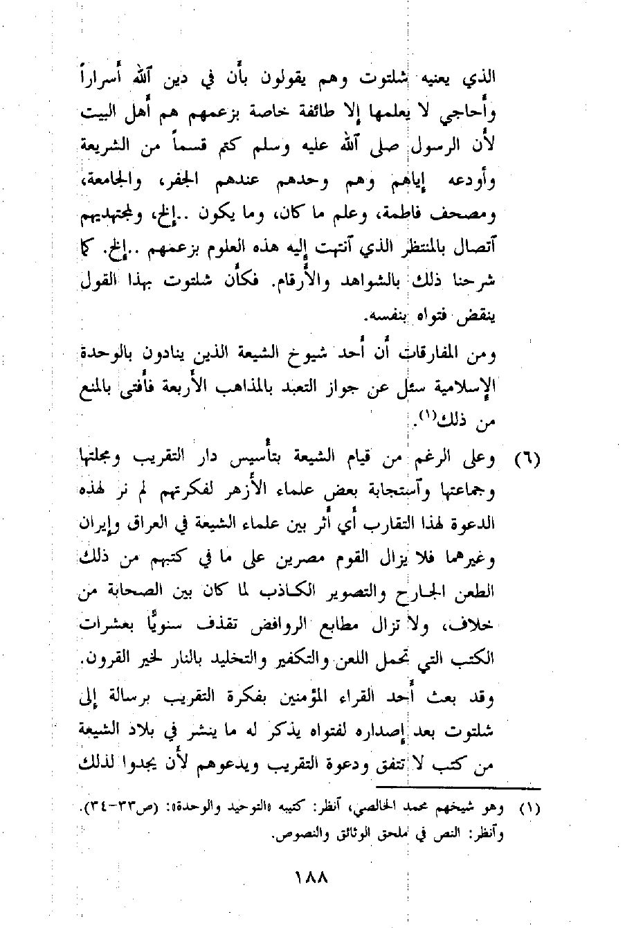 مبنية على تصديق شلتوت لدعاوى القمي وغيره بأنه لا خلاف بين السنّة والشيعة؟. الذي أرجحه بناء على ما سمعته من بعض معاصري شلتوت ومجالسيه هو الثاني، ومما يؤكد جهل الشيخ شلتوت بالشيعة أنه يرى أن السبيل الوحيد إلى إعادة الصف الإسلامي إلى وحدته وقوته أن لا يتخذ بعضنا بعضاً أرباباً من دون الله، وأن نطرح وراء ظهورنا تلكم التأويلات البعيدة للنصوص الشرعية من كتاب وسنّة صحيحة، وأن نفهمها كما فهمها المعاصرون للتنزيل وأن نجعل أهواءنا تبعاً لديننا ولا نجعل ديننا تبعاً لأهوائنا، وأن نحارب احتكار فرد أو أفراد تعاليم الدين، فما كان الإسلام دين أسرار وأحاج لا يعرفها إلا طائفة خاصة تطلع عليها من تشاء وتمنعها عمن تشاء، فما انتقل الرسول - صلى الله عليه وسلم - إلى الرفيق الأعلى حتى بلغ الرسالة وأدى الأمانة، وطلب من أصحابه وأتباعه أن يبلغوا ما علموه ... (¬1) .