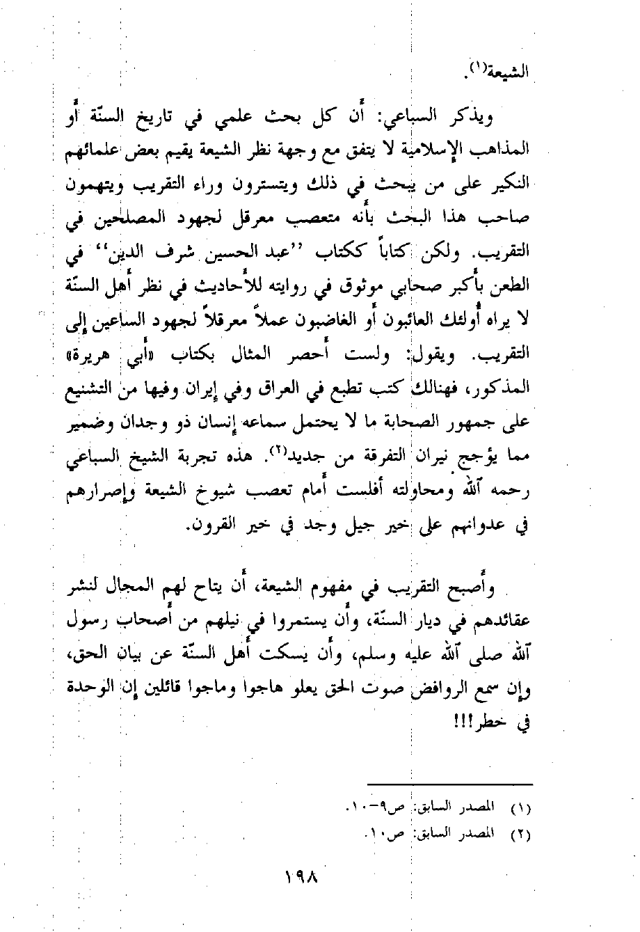 ويذكر السباعي أن غاية ما قدم شيوخ الشيعة تجاه فكرة التقريب هي جملة من المجاملة في الندوات والمجالس مع استمرار كثير منهم في سب الصحابة وإساءة الظن بهم، واعتقاد كل ما يروى في كتب أسلافهم من تلك الروايات والأخبار (¬4) . ويذكر أنهم وهم ينادون بالتقريب لا يوجد لروح التقريب أثر لدى علماء الشيعة في العراق وإيران، فلا يزال القوم مصرين على ما في كتبهم من ذلك الطعن الجارح والتصوير المكذوب لما كان بين الصحابة من خلاف، كأن المقصود من دعوة التقريب هي تقريب أهل السنّة إلى مذهب الشيعة (¬5) .