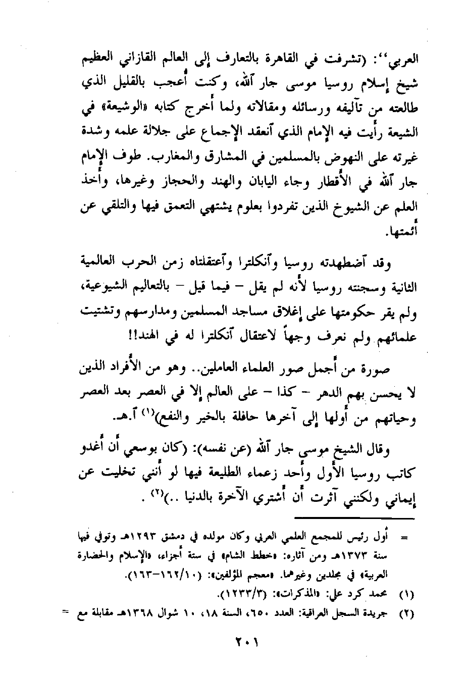 موسى بن جار الله التركستاني القازاني الروسي، شيخ مشايخ روسيا، ولد بمدينة رستون الواقعة على نهر الدون بروسيا عام 1295هـ، وتعلم في المدارس الإسلامية بمدينة قازان ثم في بخارى، وتولى إمامة الجامع الكبير في بتروغراد (ليننغراد) ، كان في العهد القيصري وبداية الحكم السوفيتي في روسيا صاحب الكلمة الأولى والأخيرة في أمور مسلمي روسيا الذين يزيدون عن ثلاثين مليون نسمة، ثم هبت عليه أعصار الشيوعية فطوحت به بعيداً عن دياره وأهله.