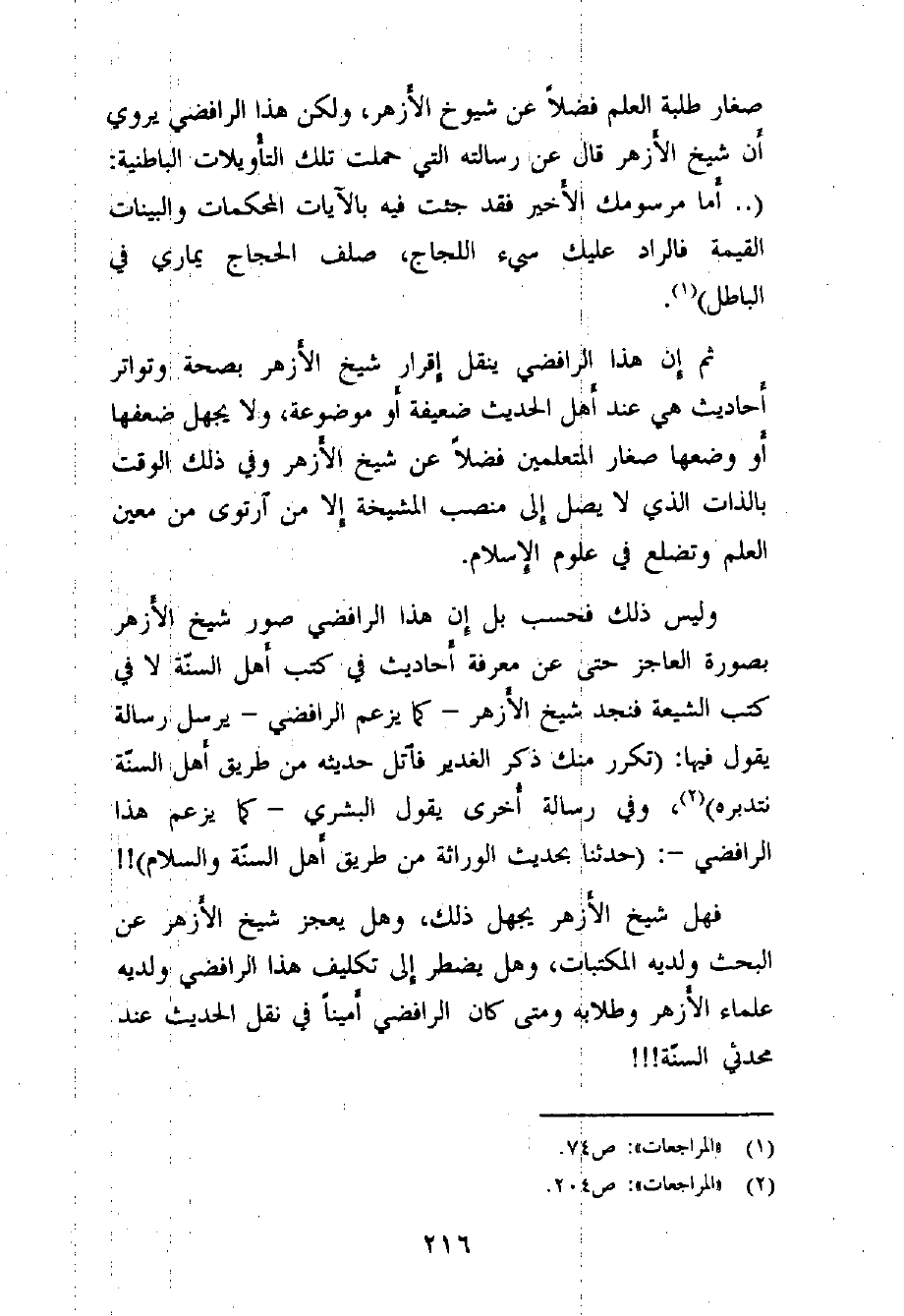 أن شيخ الأزهر سليم البشري - وهو في ذلك الوقت شيخ الأزهر في العلم والمكانة لا في المنصب والوظيفة - يسلم لهذا الرافضي ذلك التفسير الباطني لكتاب الله (- والذي أسلفنا عرضه في مبحث آراء دعاة التقريب في تأويل القرآن (¬5) - وهو تأويل ينكره