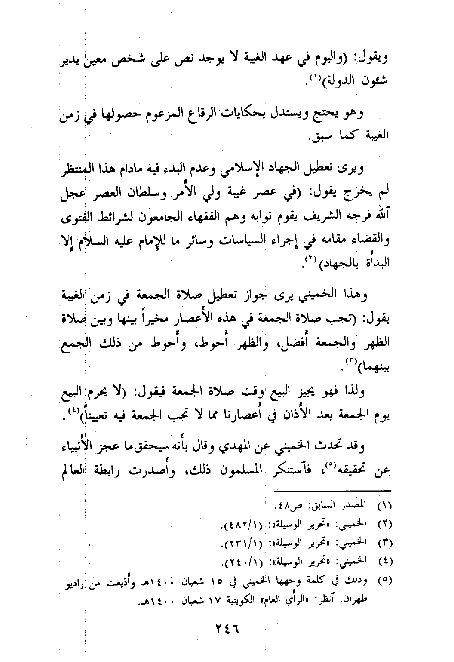 (¬5) لاحظ هذا النص، ألا تشعر منه أن الخميني يدرك أن الغيبة خرافة وأن هذا المنتظر لم يوجد أصلاً، ولذلك هو مستبعد رجوعه من غيبته. ولكن لولا عقيدة الغيبة المزعومة لم يكن للخميني هذه المكانة باسم النيابة عن الغائب، ولم يحصل على تلك الأموال الطائلة باسم "الخمس"، لذا فلن يصرح بإنكارها وإن اعتقد خرافتها. ولعل استبعاده لرجوعه من أسباب مناداته بالنيابة الكاملة عن المنتظر.