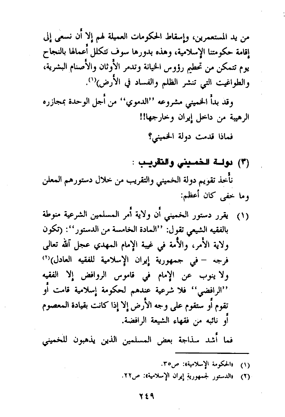 (¬2) وقد رأيت بعد ذلك أن أحد الشيعة قد أنكر هذا الاجتهاد من شيخهم واستدل لنقضه بما جاء في كتابهم «الوسائل» وهو: (وأما وجه الصدقات فإنما هي لأقوام ليس لهم في الإمارة نصيب) . محمد جواد مغنية: «الخميني والدولة الإسلامية» : (ص 99 - 100) .