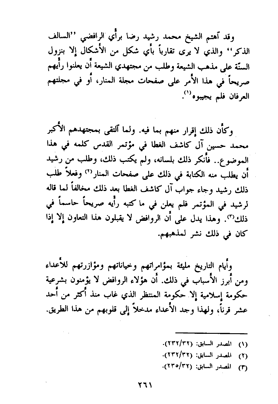 وعقب الشيخ رشيد رضا على رأي الشيعي هذا بأن تاريخ الشيعة مع أهل السنّة يؤيده؛ فهو تاريخ حافل بالغدر والخيانة وممالأة الأعداء ومناصرتهم ضد أهل السنّة (¬4) .