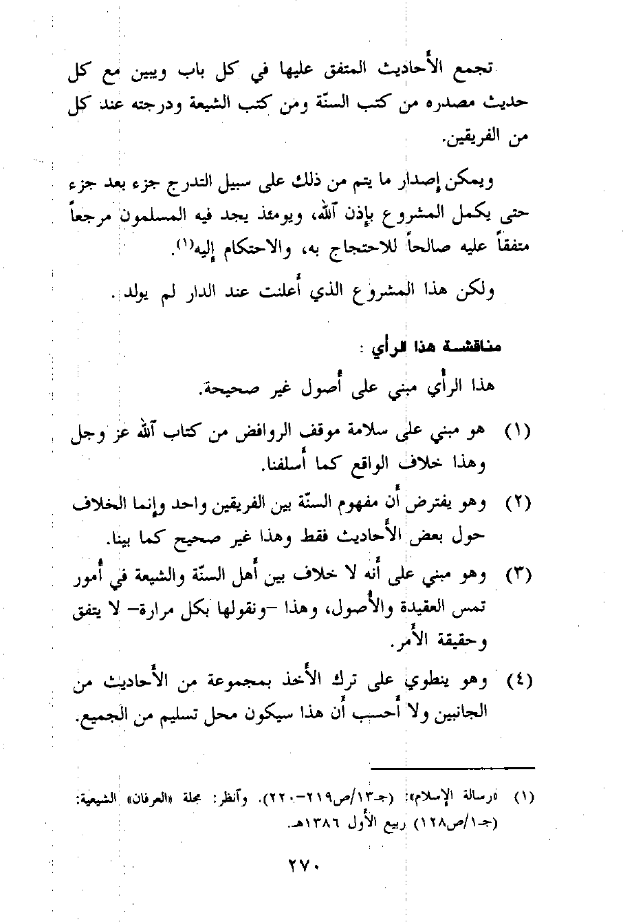 فإذا اتفقنا على الاحتجاج - في هذا الباب - بالقرآن الكريم وما أجمع الفريقان على صحته من الحديث وأغفلنا ما وراء ذلك ـ إذا كان لا يدخل في أصول العقائد ولا ثمرة عملية له ـ زال كل خلاف بين الطرفين وقضينا على هذه الفرقة غير المجدية التي طال أمدها) (¬1) .