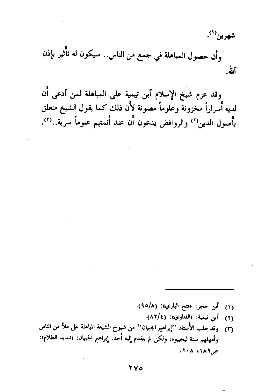 ولعل من الوسائل لحل الخلاف في أصول الدين وإبطال دعاوى الروافض حول القرآن والسنّة أن يلجأ إلى المباهلة. وهي من السنّة؛ فالرسول - صلى الله عليه وسلم - أراد مباهلة نصارى نجران (¬2) قال ابن حجر: (وفي قصة أهل نجران من الفوائد.. مشروعية مباهلة المخالف إذا أصر بعد ظهور الحجة. وقد دعا ابن عباس إلى ذلك ثم الأوزاعي، ووقع ذلك لجماعة من العلماء، ومما عرف بالتجربة أن من باهل وكان مبطلاً لا تمضي عليه سنة من يوم المباهلة، ووقع لي ذلك مع شخص كان يتعصب لبعض الملاحدة فلم يقم بعدها غير