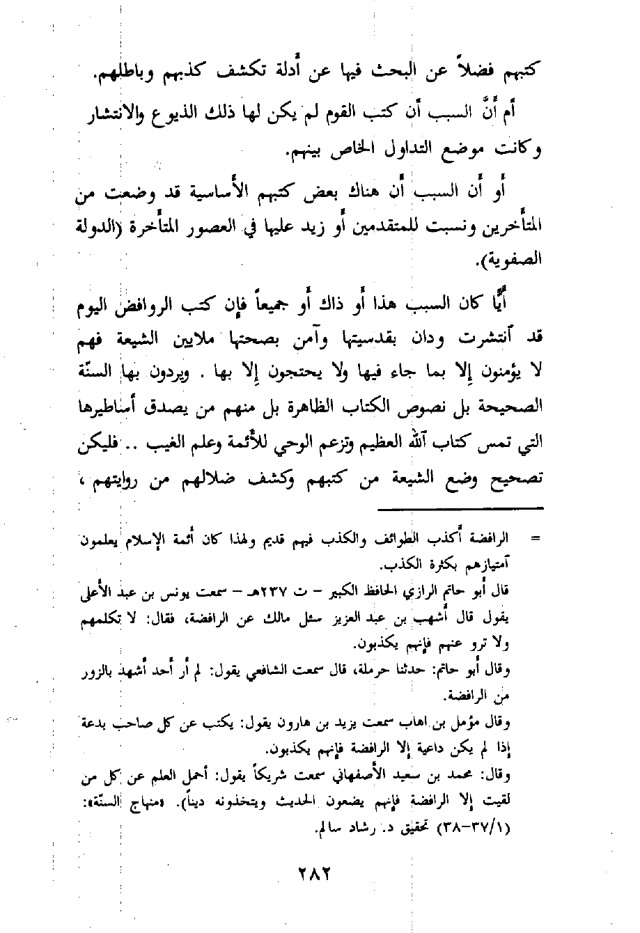 وهذا "المنهج" لم يسلكه علماؤنا المتقدمون الذين اهتموا بالرد على الروافض وتفنيد حججهم ودحض دعاواهم، وما ندري هل السبب في ذلك أن علماءنا - يرحمهم الله تعالى - كانوا يحتقرونهم ويرونهم مصدر الكذب ومعين التزوير (¬1) فأعرضوا عن النظر في