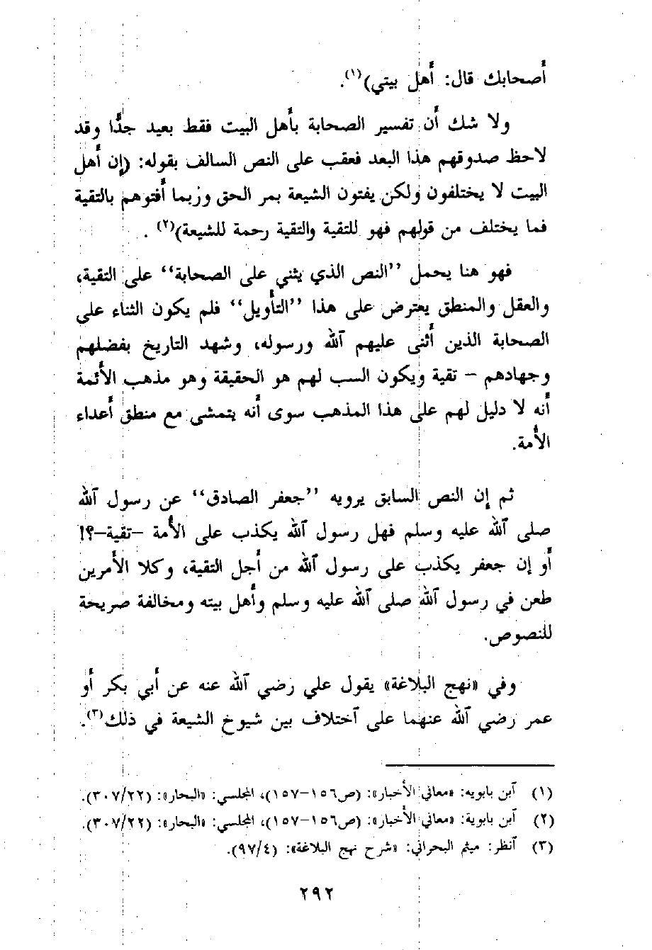 وفي «معاني الأخبار» لشيخهم ابن بابويه القمي "الصدوق" عن جعفر بن محمد عن آبائه "ع" قال: قال رسول الله - صلى الله عليه وسلم -: (ما وجدتم في كتاب الله - عز وجل - فالعمل لكم به، لا عذر لكم في تركه، وما لم يكن في كتاب الله - عز وجل - وكانت فيه سنة مني فلا عذر لكم في ترك سنتي، وما لم يكن فيه سنة مني فما قال أصحابي فقولوا به، فإنما مثل أصحابي فيكم كمثل النجوم بأيها أخذ اهتدى، وبأي أقاويل أصحابي أخذتم اهتديتم [ثم زاد دعاة التفرقة على هذا النص الزيادة التالية] فقيل: يا رسول الله، ومن