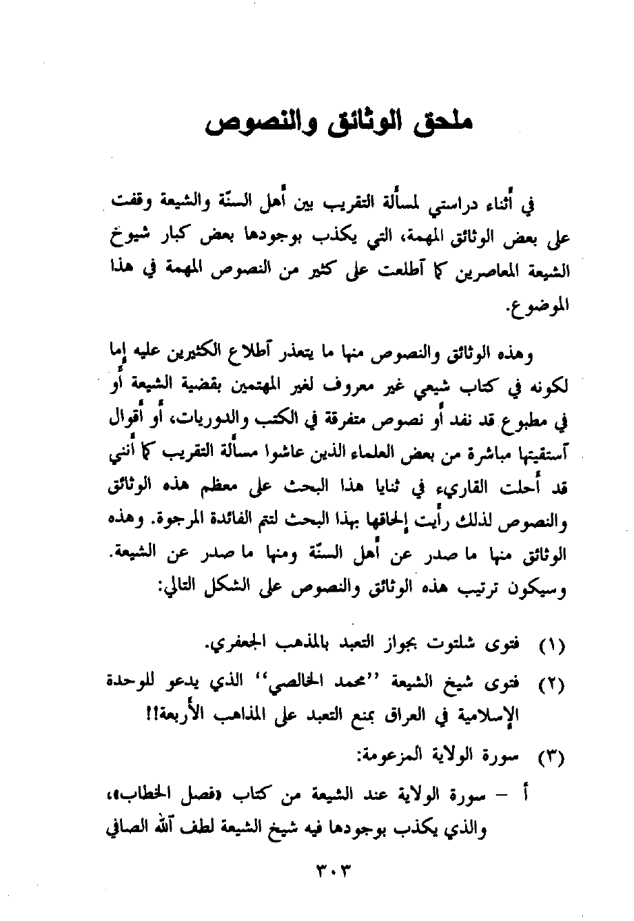 7- كيف يمكن التقريب مع من: يطعن في كتاب الله، ويفسره على غير تأويله، ويزعم تنزل كتب إلهية على أئمته بعد القرآن الكريم، ويرى الإمامة نبوة، والأئمة عنده كالأنبياء أو أفضل، ويفسر عبادة الله وحده والتي هي رسالة الرسل كلهم بغير معناها الحقيقي، ويزعم أنها طاعة الأئمة، وأن الشرك بالله طاعة غيرهم معهم، ويكفر خيار صحابة رسول الله - صلى الله عليه وسلم - ويحكم بردة جميع الصحابة إلا ثلاثة أو أربعة أو سبعة - على اختلاف رواياتهم -، ويشذ عن جماعة المسلمين بعقائد في الإمامة، والعصمة، والتقية، ويقول بالرجعة، والغيبة، والبداء. ومعظم هذه الآراء كانت في نظر السلف من عقائد الباطنية والغلاة الكفرة، ولكنها مستفيضة في كتب الاثني عشرية، وقد بينا ذلك بالشواهد.
