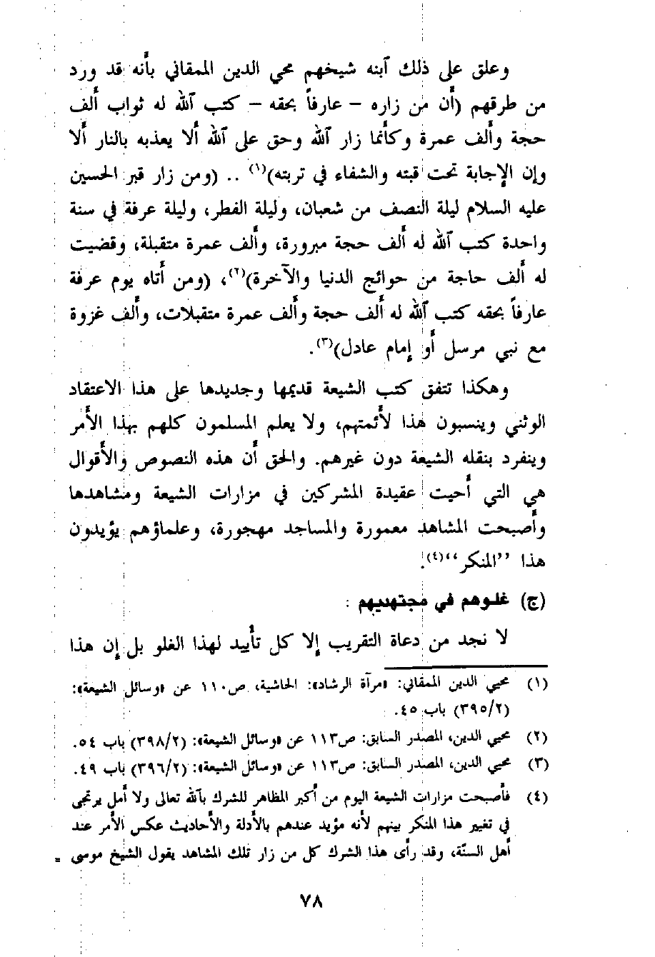 وهكذا تتفق كتب الشيعة قديمها وجديدها على هذا الاعتقاد الوثني وينسبون هذا لأئمتهم، ولا يعلم المسلمون كلهم بهذا الأمر وينفرد بنقله الشيعة دون غيرهم. والحق أن هذه النصوص والأقوال هي التي أحيت عقيدة المشركين في مزارات الشيعة ومشاهدها وأصبحت المشاهد معمورة والمساجد مهجورة، وعلماؤهم يؤيدون هذا "المنكر" (¬4) .