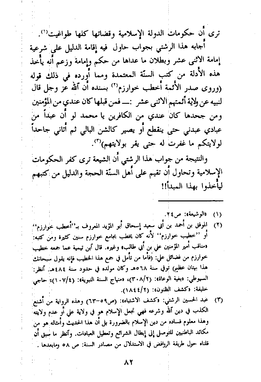 والنتيجة من جواب هذا الرشتي أن الشيعة ترى كفر الحكومات الإسلامية، وتحاول أن تقيم على أهل السنّة الحجة والدليل من كتبهم ليأخذوا بهذا المبدأ!!