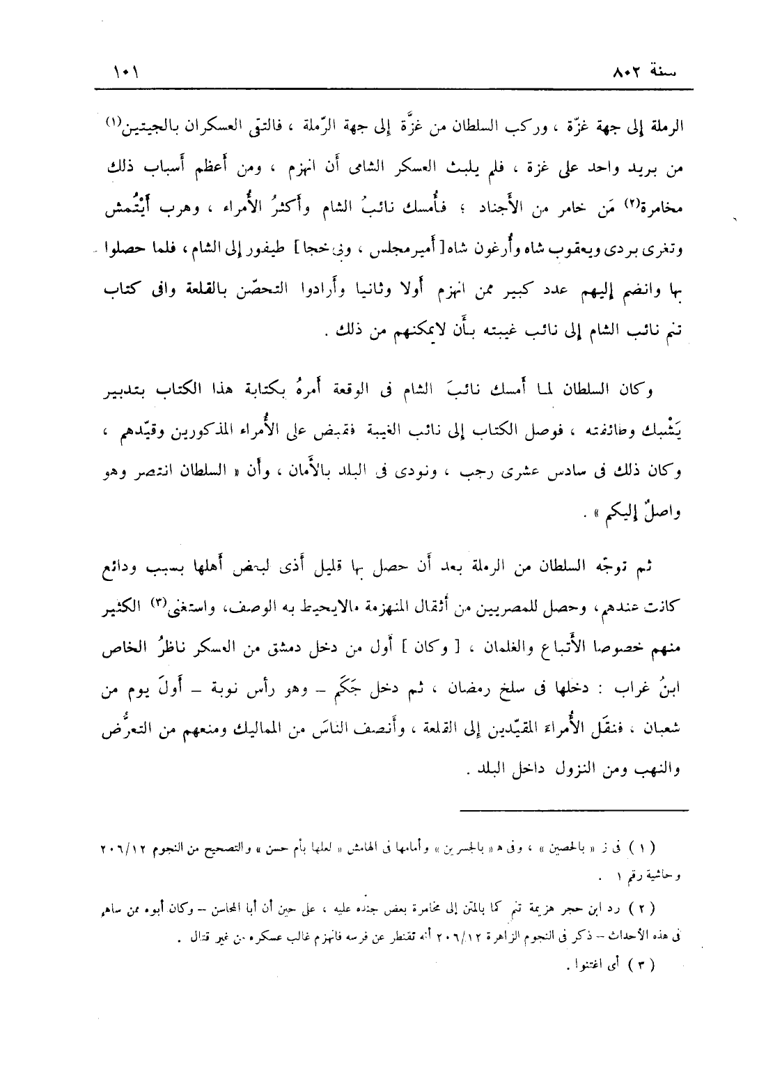 الرملة إلى جهة غزة وركب السلطان من غزة إلى جهة الرملة، فالتقى العسكران بأم حسن من بريد واحد على غزة فلم يلبث العسكر الشامي أن انهزم، ومن أعظم أسباب ذلك مخامرة من خامر من الأجناد، فأمسك نائب الشام وأكثر الأمراء وهرب أيتمش وتغري بردى ويعقوب شاه وأرغون شاه وطيفور إلى الشام، فلما حصلوا بها وانضم إليهم عدد كثير ممن انهزم أولاً وثانياً وأرادوا التحصن بالقلعة وافى كتاب من نائب الشام إلى نائب غيبته بأن لا يمكنهم من ذلك، وكان السلطان لما أمسك نائب الشام في الوقعة أمره بكتابة هذا الكتاب بتدبير يشبك وطائفته، فوصل الكتاب إلى نائب الغيبة فقبض على الأمراء المذورين وقيدهم، وكان ذلك في سادس عشر رجب ونودي في البلد بالأمان والاطمئنان وأن السلطان انتصر وهو واصل إليكم، ثم توجه السلطان من الرملة بعد أن حصل بها قليل أذى لبعض أهلها بسبب ودائع كانت عندهم، وحصل للمصريين من أثقال المنهزمة ما لا يحيط به الوصف واستغنى الكثير منهم خصوصاً الأتباع والغلمان وأول من دخل دمشق من العسكر ناظر الخاص ابن غراب، دخلها في سلخ رجب ثم دخل جكم وهو رأس نوبة في أول يوم من شعبان فنقل الأمراء المقيدين إلى القلعة وأنصف الناس من المماليك ومنعهم من التعرض والنهب ومن النزول داخل البلد