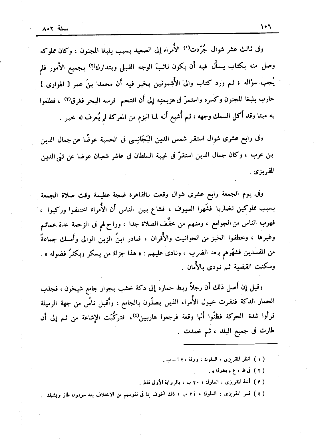 وفي يوم الجمعة رابع عشري شوال وقع بالقاهرة ضجة عظيمة وقت صلاة الجمعة بسبب مملوكين تضاربا فشهرا السيوف، فشاع بين الناس أن الأمراء اختلفوا وركبوا فهرب الناس من الجوامع ومنهم من خفف الصلاة جداً وراح لهم في الزحمة عدة عمائم وغيرها وخطفوا الخبز من الحوانيت والأفران، فبادر بن الزين الوالي وأمسك جماعة من المفسدين فشهرهم بالضرب ونادى عليهم: هذا جزاء من يسكر ويكثر الفضول وسكنت الفتنة ثم نودي بالأمان، وقيل إن أصل ذلك رجلاً ربط حماره إلى دكة بجوار جامع شيخون فجذب الحمار الدكة فنفرت خيول الأمراء الذي يصلون في الجامع وأقبل ناس من جهة الرميلة فرأوا شدة الحركة فظنوا أنها وقعة فرجعوا هاربين فتركبت الإشاعة من ثم إلى أن طارت في جميع البلد ثم خمدت.