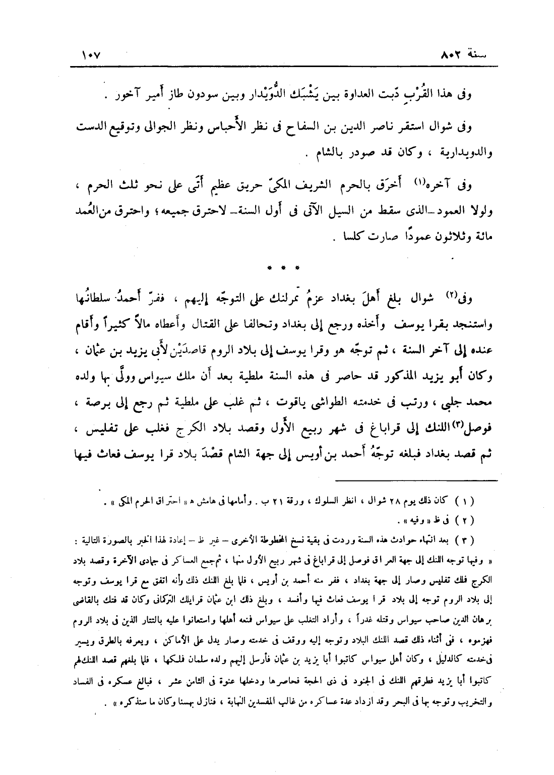 وفي شوال بلغ أهل بغداد عزم تمرلنك إلى التوجه إليهم ففر أحمد سلطانها واستنجد بقرا يوسف وأخذه ورجع إلى بغداد وتحالفاعلى القتال وأعطاه مالاً كثيراً وأقام عنده إلى آخر السنة، ثم توجه هو وقرا يوسف إلى بلاد الروم قاصدين لأبي يزيد بن عثمان وكان أبو يزيد المذكور قد حاصر في هذه السنة ملطية بعد أن ملك سيواس وولى بها ولده محمداً جالبي ورتب في خدمته الطواشي ياقوت ثم غلب على ملطية ثم رجع إلى برصا، فوصل اللنك إلى قراباغ في شهر ربيع الأول وقصد بلاد الكرج فغلب على تفليس ثم قصد بغداد، فبلغه توجه أحمد ابن أويس إلى جهة الشام فقصد بلاد قرا يوسف فعاث فيها