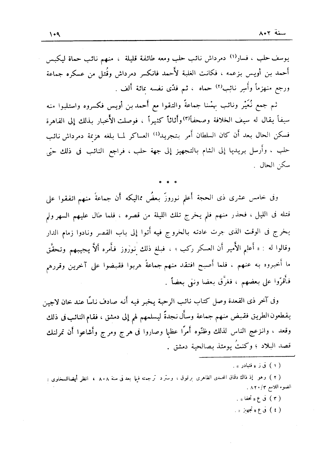 يوسف حلب، فسار دمرداش نائب حلب ومعه طائفة قليلة منهم نائب حماة ليكبس أحمد بن أويس بزعمه، فكانت الغلبة لأحمد فانكسر دمرداش وقتل من عسكره جماعة ورجع منهزماً، وأسر نائب حماة ثم فدى نفسه بمائة ألف درهم، ثم جمع نعير والنائب ببهنسا والتقوا مع أحمد بن أويس فكسروه واستلبوا منه سيفاً يقال له سيف الخلافة وصحفاً وأثاثاُ كثيراً، فوصلت الأخبار بذلك إلى القاهرة، فسكن الحال بعد أن كان السلطان أمر بتجريد العساكر لما بلغته هزيمة دمرداش نائب حلب وأرسل بريداً إلى الشام بالتجهيز إلى جهة حلب فراجع النائب في ذلك حتى سكن الحال.