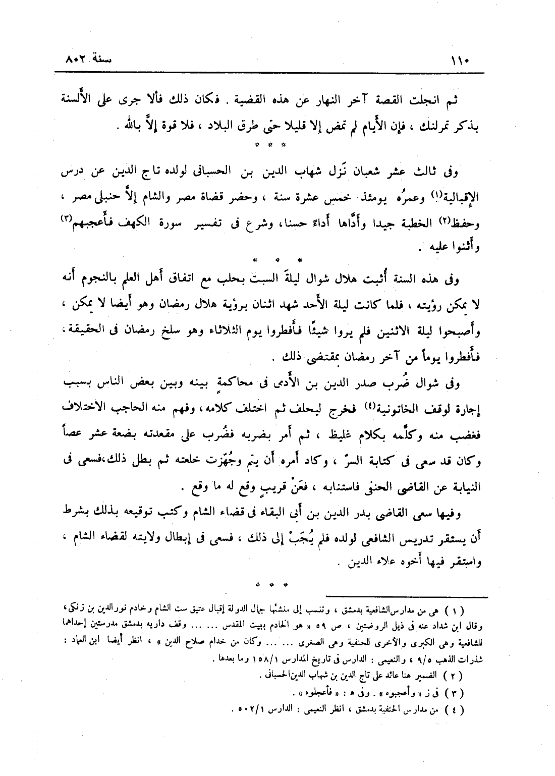 وفي ثالث شعبان نزل شهاب الدين الحسباني لولده تاج الدين عن درس الإقبالية وعمره يومئذ خمس عشرة سنة وحضره قضاة مصر والشام إلا حنبلي مصر وحفظ الخطبة جيداً وأداها أداءً حسناً وشرع في تفسير سورة الكهف وأعجبهم وأثنوا عليه.