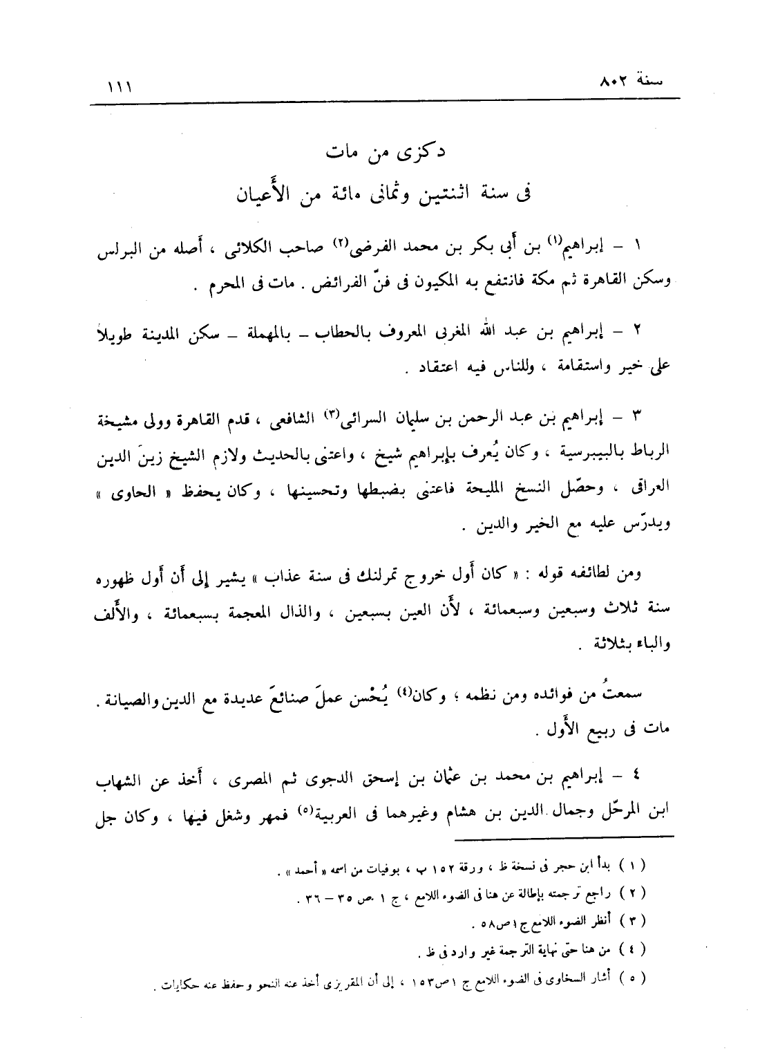 إبراهيم بن عبد الرحمن بن سليمان السرائي الشافعي، قدم القاهرة وولي مشيخة الرباط بالبيبرسية وكان يعرف بإبراهيم شيخ، واعتنى بالحديث كثيراً ولازم الشيخ زين الدين العراقي وحصل النسخ المليحة فاعتنى بضبطها وتحسينها وكان يحفظ الحاوي ويدرس غالبه مع الخير والدين.