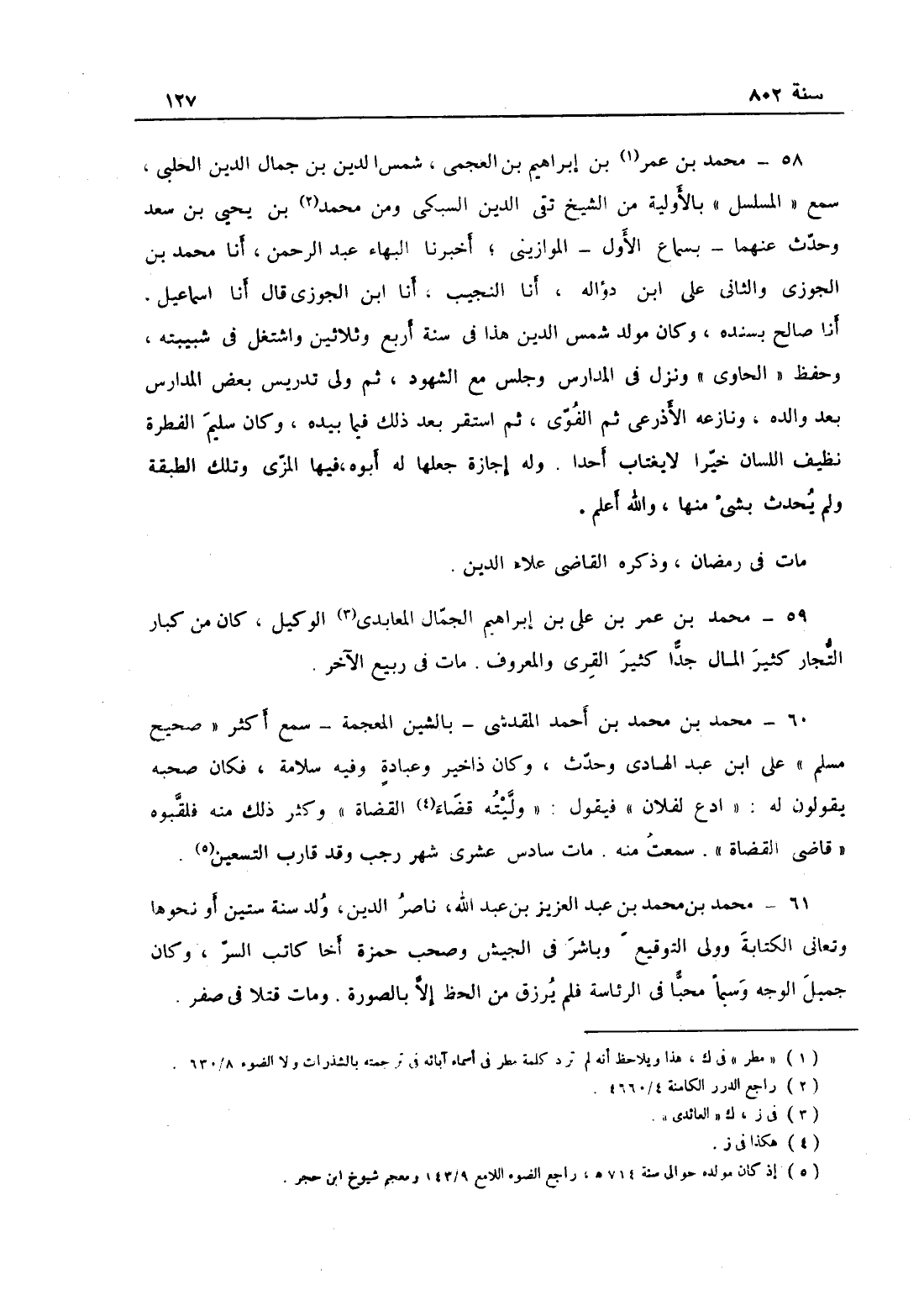 محمد بن محمد بن أحمد المقدشي بالشين المعجمة سمع أكثر صحيح مسلم على ابن عبد الهادي وحدث، وكان ذا خير وعبادة وفيه سلامة فكان أصحابه يقولون له: ادع لفلان، فيقول: وليته قضاء العسكر، فكثر ذلك منه فلقبوه قاضي القضاة سمعت منه؛ مات في سادس عشرى شهر رجب وقد قارب التسعين.