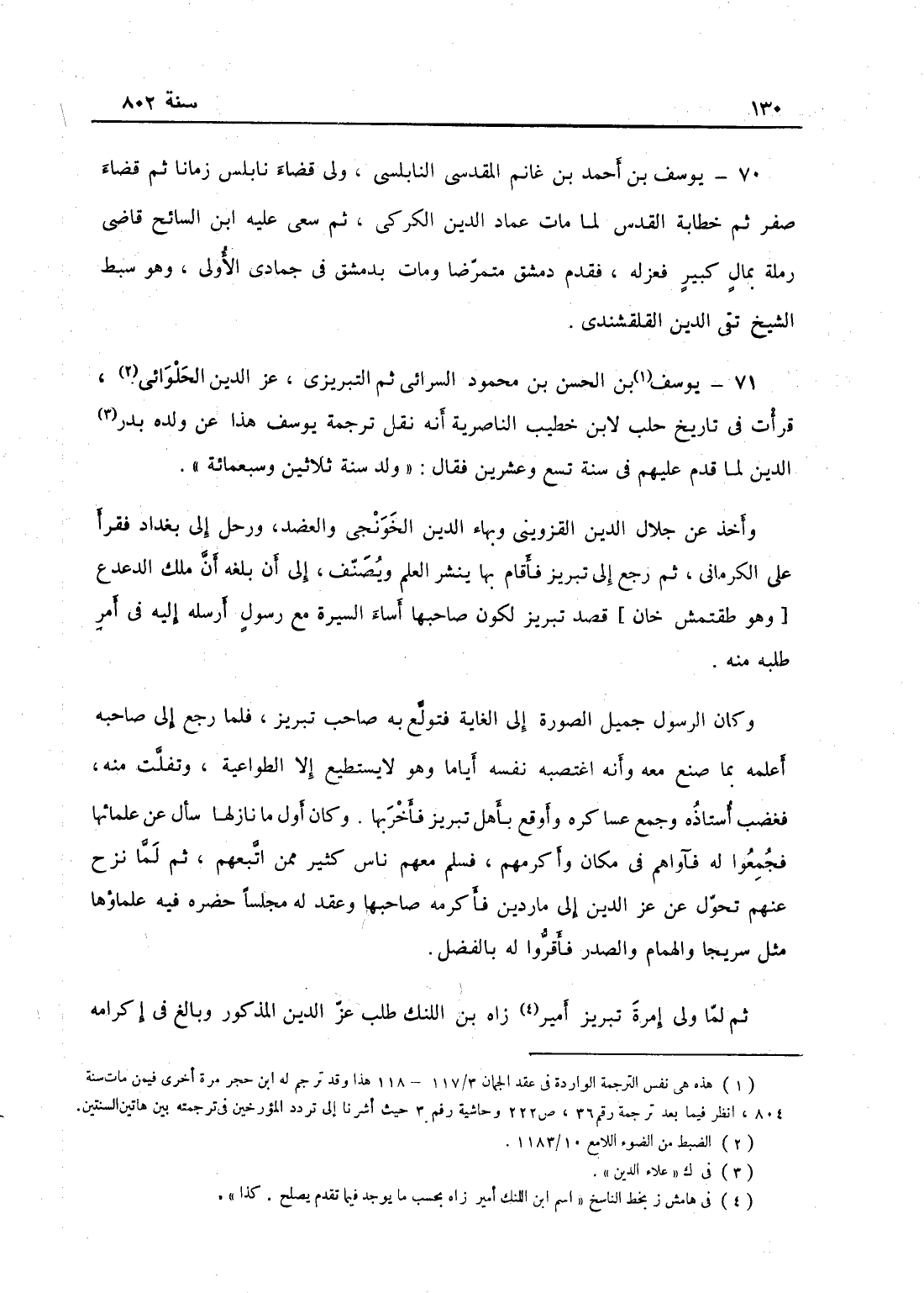 يوسف بن الحسن بن محمود السرائي ثم التبريزي عز الدين الحلوائي، قرأت في تاريخ حلب لابن خطيب الناصرية أنه نقل ترجمة يوسف هذا عن ولده بدر الدين لما قدم عليهم في سنة تسع وعشرين فقال: ولد سنة ثلاثين وسبعمائة وأخذ عن جلال الدين القزويني وشهاب الدين الخونجي والعضد، ورحل إلى بغداد فقرأ على الكرماني ثم رجع إلى تبريزفأقام بها ينشر العلم ويصنف إلى أن بلغه أن ملك الدعدع قصد تبريز لكون صاحبها أساء السيرة مع رسول أرسله إليه في أمر طلبه منه وكان الرسول جميل الصورة إلى الغاية فتولع به صاحب تبريز فلما رجع إلى صاحبه أعلمه بما صنع معه وأنه اغتصبه نفسه أياماً وهو لا يستطيع الطواعية وتفلت منه، فغضب أستاذه وجمع عسكره وأوقع بأهل تبريز فأخربها، وكان أول ما نازلها سأل عن علمائها فجمعوا له فآواهم في مكان وأكرمهم فسلم معهم ناس كثير ممن اتبعهم، ثم لما نزح عنهم تحول عز الدين إلى ماردين فأكرمه صاحبها وعقد له مجلساً حضره فيه علماءها مثل شريحا الهمام والصدر فأقروا له بالفضل، ثم لما ولي إمرة تبريز أميرزاه ابن اللنك طلب عز الدين المذكور وبالغ في إكرامه