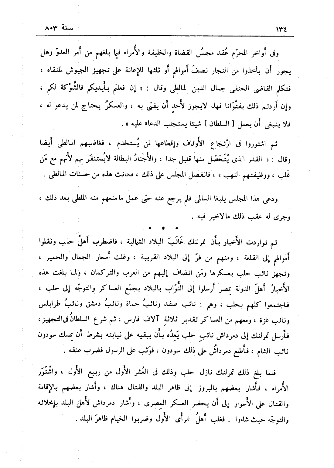 وفي أواخر المحرم عقد مجلس بالقضاة والخليفة والأمراء واشتوروا فيما بلغهم من أمر العدو وهل يجوز أن يأخذوا من التجار نصف أموالهم أو ثلثها للاعانة على تجهيز الجيوش لملتقاه، فتكلم القاضي الحنفي جمال الدين الملطي وقال: إن فعلتم بأيديكم فالشوكة لكم وإن أردتم ذلك بفتوانا فهذا لا يجوز لأحد أن يفتي به والعسكر يحتاج لمن يدعو له فلا ينبغي أن يعمل شيء يستجلب الدعاء عليه، ثم اشتوروا ثانية في ارتجاع الأوقاف وإقصاعها لمن يستخدم، فعارضهم الملطي أيضاً وقال: القدر الذي يتحصل منها قليل جداً والأجناد البطالة لا يستنصر بهم إلا مع من غلب ووظيفتهم النهب، فانفصل المجلس على ذلك فكانت هذه من حسنات الملطي، ووعى هذا المجلس يلبغا السالمي فلم يرجع عنه حتى عمل ما منعهم منه الملطي، بعد ذلك وجرى له عقب ذلك ما لا خير فيه، ثم تواردت الأخبار بأخذ تمرلنك غالب البلاد الشمالية، فاضطرب أهل حلب ونقلوا أموالهم إلى القلعة ومنهم من فر إلى البلاد القريبة وغلت أسعار الجمال والحمير وتجهز نائب حلب بعسكرها ومن انضاف إليهم من العرب والتركمان ولما بلغت هذه الأخبار أهل الدولة بمصر أرسلوا إلى النواب بالبلاد بجمع العساكر والتوجه إلى حلب فاجتمعوا كلهم بحلب وهو نائب صفد ونائب حماة دقماق ونائب دمشق سودون قريب السلطان ونائب طرابلس شيخ الذي ولي السلطنة بعد ونائب غزة ومعهم من العسكر تقدير ثلاثة آلاف فارس، ثم شرع السلطان في التجهيز فأرسل تمرلنك إلى دمرداش نائب حلب يعده بأن يبقيه على نيابته بشرط أن يمسك سودون نائب الشام، فاطلع دمرداش على ذلك سودون فوثب على الرسول فضرب عنقه، فلما بلغ ذلك تمرلنك نازل حلب وذلك في العشر الأول من ربيع الأول، واشتور الأمراء فأشار بعضهم بالبروز إلى ظاهر البلد والقتال هناك وأشار البعض بالإقامة والقتال على الأسوار إلى أن يحضر العسكر المصري وأشار دمرداش لأهل البلد بإخلائها والتوجه حيث شاؤوا، فغلب أهل الرأي الأول وضربوا الخيام ظاهر البلد