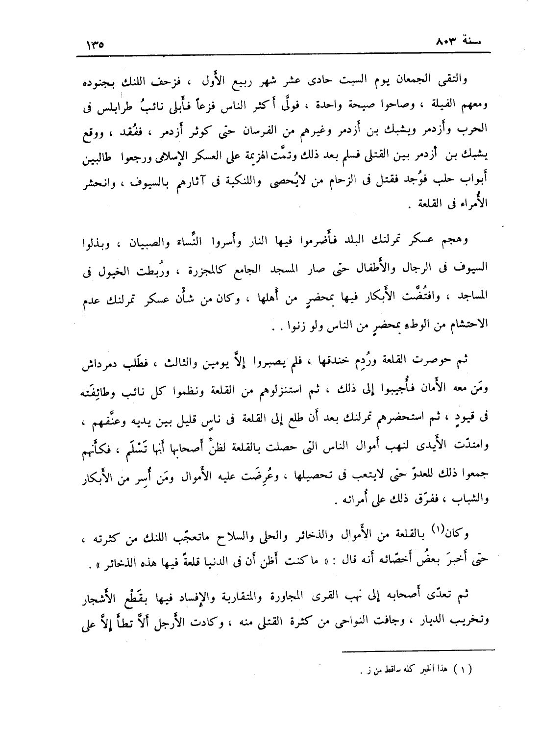 نائب وطائفته في قيودهم، ثم استحضرهم تمرلنك بعد أن طلع القلعة في ناس قليل بين يديه وعنفهم، وامتدت الأيدي لنهب أموال الناس التي حصنت بالقلعة لظن أصحابها أنها تسلم فكأنهم جمعوا ذلك للعدو حتى لا يتعب في تحصيلها، وعرضت عليه الأموال ومن أسر من الأبكار والشباب ففرق ذلك على أمرائه وكان بالقلعة من الأموال والذخائر والحلي والسلاح ما تعجب اللنك من كثرته حتى أخبر بعض أخصائه أنه قال: ما كنت أظن أن في الدنيا قلعة فيها هذه الذخائر، ثم تعدى أصحابه إلى نهب القرى المجاورة والمتقاربة والإفساد فيها بقطع الأشجار وتخريب الديار وجافت النواحي من كثرة القتلى حتى كادت الأرجل أن لا تطأ إلا على جثة إنسان وبني من رؤوس القتلى عدة مواذن منها ثلاث في رابية بن جاجا وهلك من الأطفال التي أسرت أماتهم بالجوع أكثر ممن قتل، وذكر القاضي محب الدين ابن الشحنة عن الحافظ الخوارزمي أنه أخبره أن ديوان اللنك اشتمل على ثمانمائة ألف مقاتل، وذكر أيضاً أن اللنك لما جلس في القلعة وطلب علماء البلد ليسألهم عن علي ومعاوية فقال له القاضي القفصي المالكي: كلهم مجتهدون، فغضب وقال: أنتم تبع لأهل الشام وكلهم يريدون ويحبون قتلة الحسين، وذكر أنه قرر في نيابة حلب لما توجه لدمشق الأمير موسى بن حاجي طغاي وكان رحيله عنها في أول يوم من شهر ربيع الآخر؛ ويقال إن أعظم الأسباب من خذلان العسكر الإسلامي ما كان دمرداش نائب حلب اعتمده من إلقاء الفتنة بين التركمان والعرب حتى أغار بعض التركمان على أموال نعير فنهبها، فغضب نعير من ذلك وسار قبل حضور تمرلنك فلم يحضر الوقعة أحد من العرب، وقال بعضهم: إن دمرداش كان قد باطن تمرلنك لكثرة ما كان تمرلنك قد خدعه ومناه. وطائفته في قيودهم، ثم استحضرهم تمرلنك بعد أن طلع القلعة في ناس قليل بين يديه وعنفهم، وامتدت الأيدي لنهب أموال الناس التي حصنت بالقلعة لظن أصحابها أنها تسلم فكأنهم جمعوا ذلك للعدو حتى لا يتعب في تحصيلها، وعرضت عليه الأموال ومن أسر من الأبكار والشباب ففرق ذلك على أمرائه وكان بالقلعة من الأموال والذخائر والحلي والسلاح ما تعجب اللنك من كثرته حتى أخبر بعض أخصائه أنه قال: ما كنت أظن أن في الدنيا قلعة فيها هذه الذخائر، ثم تعدى أصحابه إلى نهب القرى المجاورة والمتقاربة والإفساد فيها بقطع الأشجار وتخريب الديار وجافت النواحي من كثرة القتلى حتى كادت الأرجل أن لا تطأ إلا على