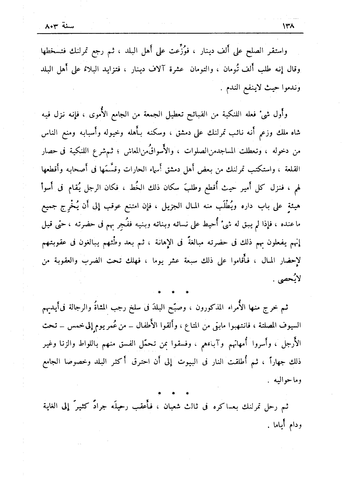 واستقر الصلح على ألف ألف دينار فوزعت على أهل البلد، ثم روجع تمرلنك فتسخطها وقال: إنه إنما طلب ألف تومان والتومان عشرة آلاف دينار، فتزايد البلاء على أهل البلد وندموا حيث لا ينفع الندم، ثم أول شيء فعله اللنك من القبائح تعطيل الجمعة من الجامع الأموي فإنه نزل فيه شاه ملك وزعم أنه نائب تمرلنك على دمشق فسكنه بأهله وخيوله وأسبابه ومنع الناس من دخوله وتعطلت من المساجد الصلوات والأسواق من المعائش وشرع اللنكية في حصار القلعة واستكتب تمرلنك من بعض أهل دمشق أسماء الحارات وقسمها في أصحابه وأقطعها لهم، فنزل كل أمير حيث أقطع وطلب سكان ذلك الخط فكان الرجل يقوم في أسوء هيئة على باب داره ويطلب منه المال الجزيل فإن امتنع عوقب إلى أن يخرج جميع ما عنده فإذا لم يبق له شيء أحيط على نسائه وبناته وبنيه فيفجر بهم حتى قيل إنهم يفعلون ذلك بهم بحضرته مبالغة في الإهانة ثم بعد وطئهم يبالغون في عقوبتهم لإحضار المال، فأقاموا على ذلك سبعة عشر يوماً فهلك تحت الضرب والعقوبة من لا يحصى، ثم خرج منها الأمراء المذكورون وصبح البلد في سلخ رجب المشاة والرجالة في أيديهم السيوف المصلتة فانتهبوا ما بقي من المتاع وألقوا الأطفال من عمر يوم إلى خمس تحت الأرجل وأسروا أمهاتهم وآباءهم ثم أطلقت النار في البيوت إلى أن أحترق أكثر البلد وخصوصاً الجامع وما حواليه، ثم رحل تمرلنك بعساكره في ثالث شعبان فأعقب رحيله جراد كثير إلى الغاية ودام أياماً،