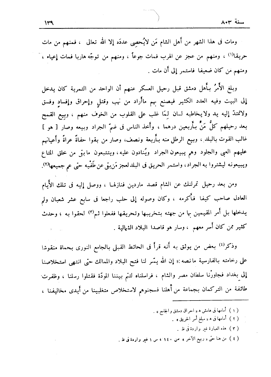 ومات في هذا الشهر من أهل الشام من لا يحصى عدده إلا الله تعالى، فمنهم من حريقاً، ومنهم عن عجز من الهرب فمات جوعاً، ومنهم من توجه هارباً فمات إعياء، ومنهن من كان ضعيفاً فاستمر إلى أن مات، وبلغ الأمر بأهل دمشق قبل رحيل العسكر عنهم ان الواحد من التمرية كان يدخل إلى البيت وفيه العدد الكثير فيصنع بهم ما أراد من نهب وقتل وإحراق وإفساد وفسق، ولا تمتد إليه يد ولا تخاطبه لسان لما غلب على القلوب من الخوف منهم، وبيع القمح بعد رحيلهم كل مد بأربعين درهماً، واخذ الناس في ضم الجراد وبيعه وصار هو غالب القوت بالبلد، وبيع الرطل منه بأربعة ونصف، وصار من بقي حفاة عراة، وأعيانهم عليهم العبي والجلود وهم يبيعون الجراد، وينادون عليه ويتتبعون ما بقي من خلق المتاع ويبيعونه ليشتروا به الجراد، واستمر الحريق في البلد لعجز من بقي عن طفيه حتى عم جميعها، ومن بعد رحيل تمرلنك عن الشام قصد ماردين فنازلها، ووصل إله في تلك الأيام العادل صاحب حصن كيفا فأكرمه وكان وصوله إلى حلب راجعاً في سابع عشر شعبان ولم يدخلها بل امر المقيمين بها من جهته بتخريبها وتحريقها ففعلوا ثم لحقوا به وحدث كثير ممن كان أسر معهم..... وسار هو قاصد البلاد الشمالية، وذكر بعض من يوثق به انه قرأ في الحائط القبلي بالجامع النوري بحماة منقوشاً على رخامة بالفارسي ما نصه: إن الله يسر لنا فتح البلاد والممالك