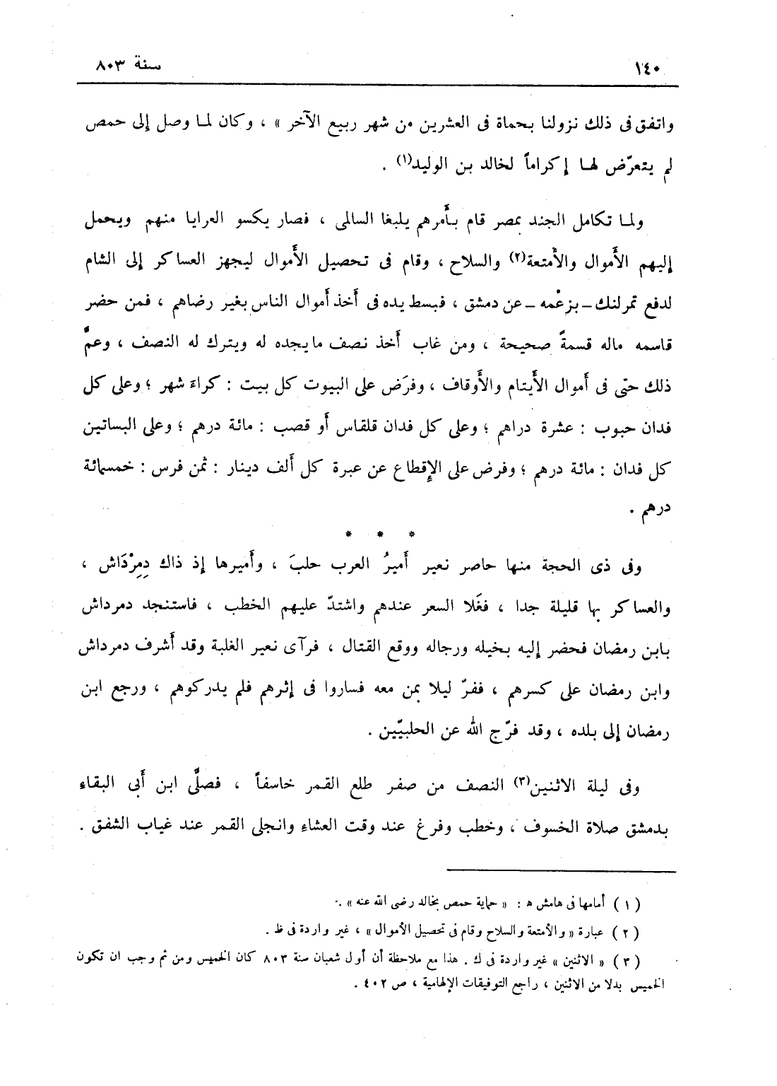 واتفق في ذلك نزولنا بحماة في العشرين من شهر ربيع الآخر، وكان لما وصل إلى حمص لم يتعرض لها إكراماً لخالد بن الوليد، ولما تكامل الجند بمصر قام بأمرهم يلبغا السالمي فصار يكسوا العرايا منهم ويحما إليهم الأموال والأمتعة والسلاح وقام في تحصيل الأموال لتجهيز العساكر إلى الشام لدفع تمرلنك بزعمه عن دمشق، فبسط يده في أخذ أموال الناس بغير رضاهم، فمن حضر قاسمه ماله قسمة صحيحة، ومن غاب أخذ نصف ما يجده له ويترك النصف وعم ذلك حتى في اموال الأيتام والأوقاف وفرض على البيوت كل بيت كراء شهر، وعلى كل فدان حبوب عشرة دراهم، وعلى كل فدان قلقاس أو قصب مائة درهم، وعلى البساتين كل فدان، مائة درهم، وفرض على الإقطاع عن عبرة كل ألف دينار ثمن فرس خمسمائة درهم.