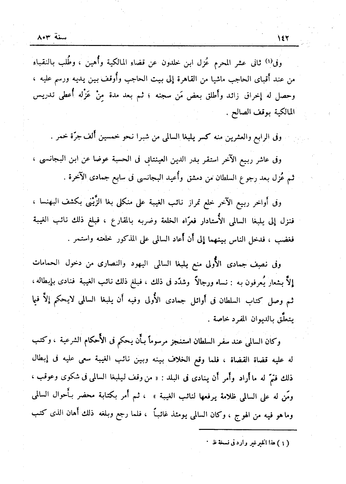 وفي ثاني عشر المحرم عزل ابن خلدون عن قضاء المالكية وأهين وطلب بالنقباء من عند آقباي الحاجب ماشياً من القاهرة إلى بيت الحاجب بالكيش وأوقف بين يديه ورسم عليه وحصل له إخراق زائد وأطلق بعض من سجنه ثم بعد مدة من عزله أعطي تدريس المالكية بوقف الصالح.