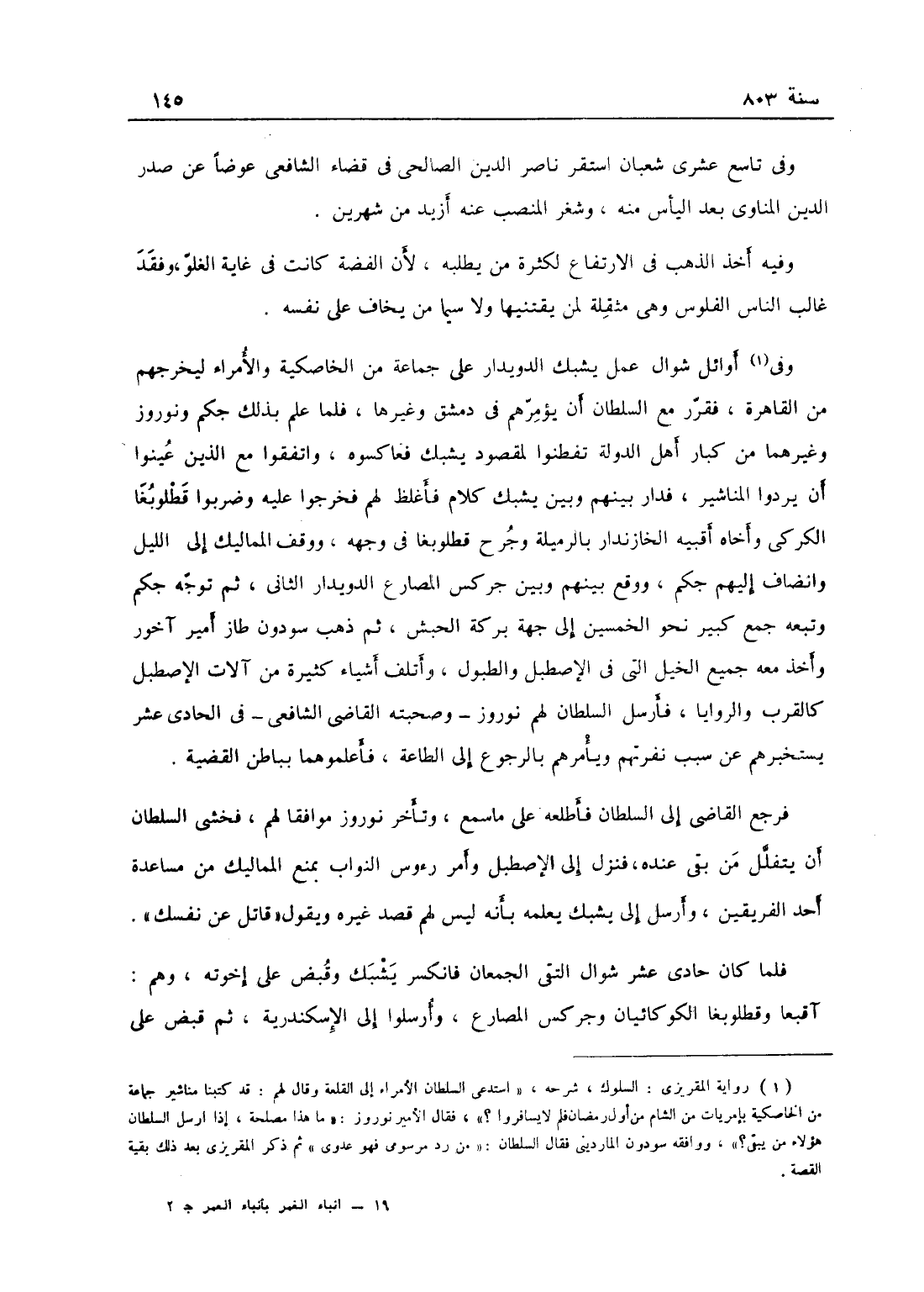 وفي تاسع عشرين شعبان استقر ناصر الدين الصالحي في قضاء الشافعية عوضاً عن صدر الدين المناوي بعد السأس منه وشغر المنصب عنه أكثر من شهرين، وفيه أخذ الذهب في الأرتفاع لكثرة من يطلبه لأن الفضة كانت في غاية الغلاء وغالب نقد الناس الفلوس وهي مثقلة لمن يقتنيها ولا سيما من يخاف على نفسه.