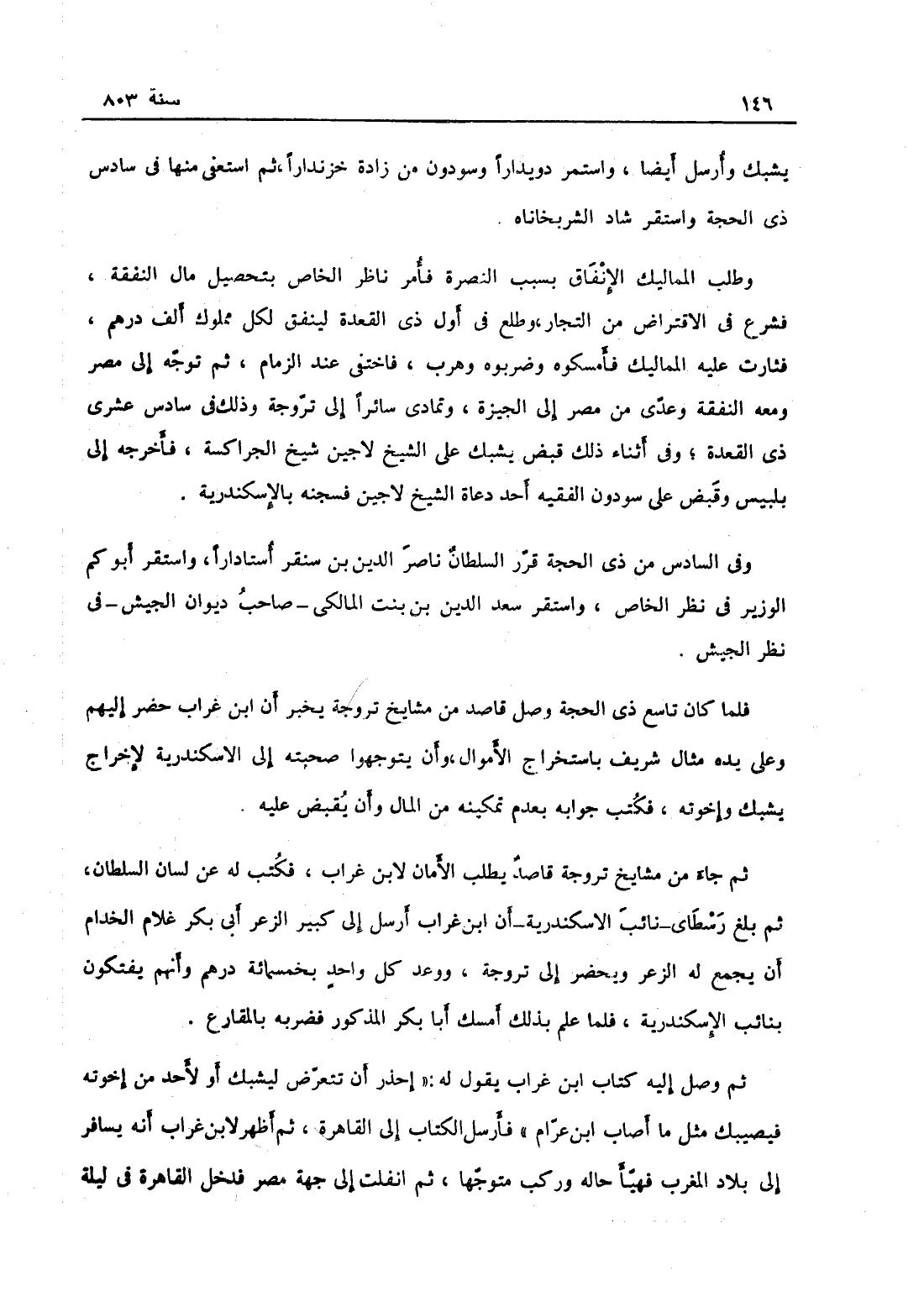 يشبك وأرسل أيضاً واستقر جكم دويداراً وسودون من زاده خازندار ثم استعفي منها في سادس ذي الحجة واستقر شاد الشربخاناه وطلب المماليك الإنفاق بسبب النصرة فامر ناظر الخاص بتحصيل مال النفقة فشرع في الاقتراض من التجار وطلع في أول ذي القعدة لينفق لكل مملوك ألف درهم فثارت عليه المماليك فأمسكوه وضربوه فهرب واختفى عند الزمام ثم توجه إلى مصر ومعه النفقة وعدا من مصر إلى الجيزة وتمادى سائراً إلى تروجة وذلك في سادس عشري ذي القعدة وفي أثناء ذلك قبض يشبك على الشيخ لاجين شيخ الجراكسة فأخرجه إلى بلبيس وقبض على سودون الفقيه أحد دعاة الشيخ لاجين وسجنه بالإسكندرية.