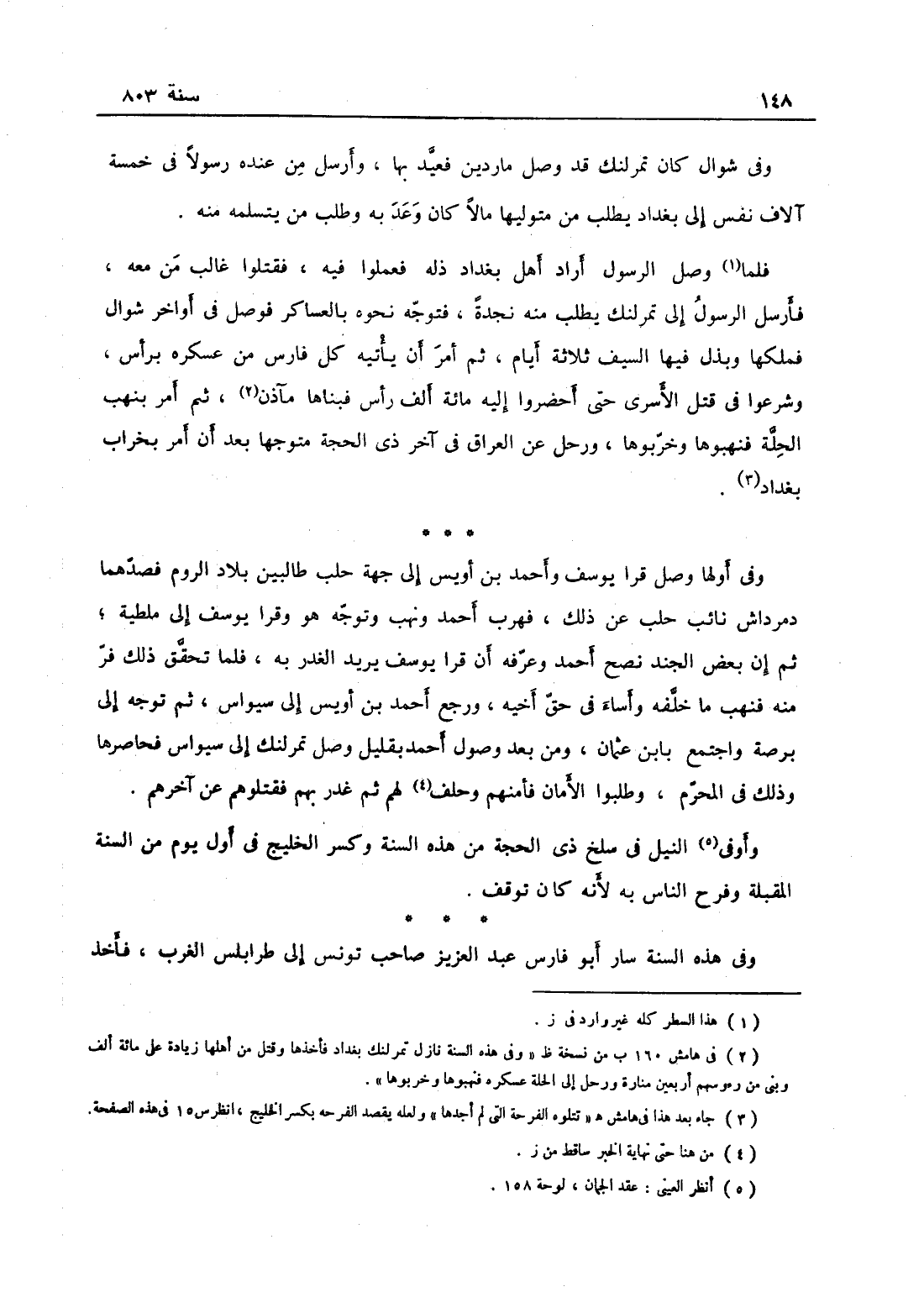 وفي شوال كان تمرلنك قد وصل ماردين فقعد بها وأرسل من عنده رسولاً في خمسة آلاف نفس إلى بغداد يطلب من متوليها مالاً كان وعد به وطلب من يتسلمه منه، فلما وصل الرسول رآه أهل بغداد في قلة فطمعوا فيه فقتلوا غالب من معه، فأرسل الرسول إلى تمرلنك يطلب منه نجدة، فتوجه بالعساكر فوصل في أواخر شوال فملكها وبذل فيها السيف ثلاثة أيام، ثم أمر أن يأتيه كل فارس من عسكره برأس فشرعوا في قتل الأسرى حتى أحضروا إليه مائة ألف رأس فبناها مواذن أربعين، ثم أمر بنهب الحلة فنهبوها وخربوها ورحل عن العراق آخر ذي الحجة متوجهاً بعد أن أمر بخراب بغداد.....