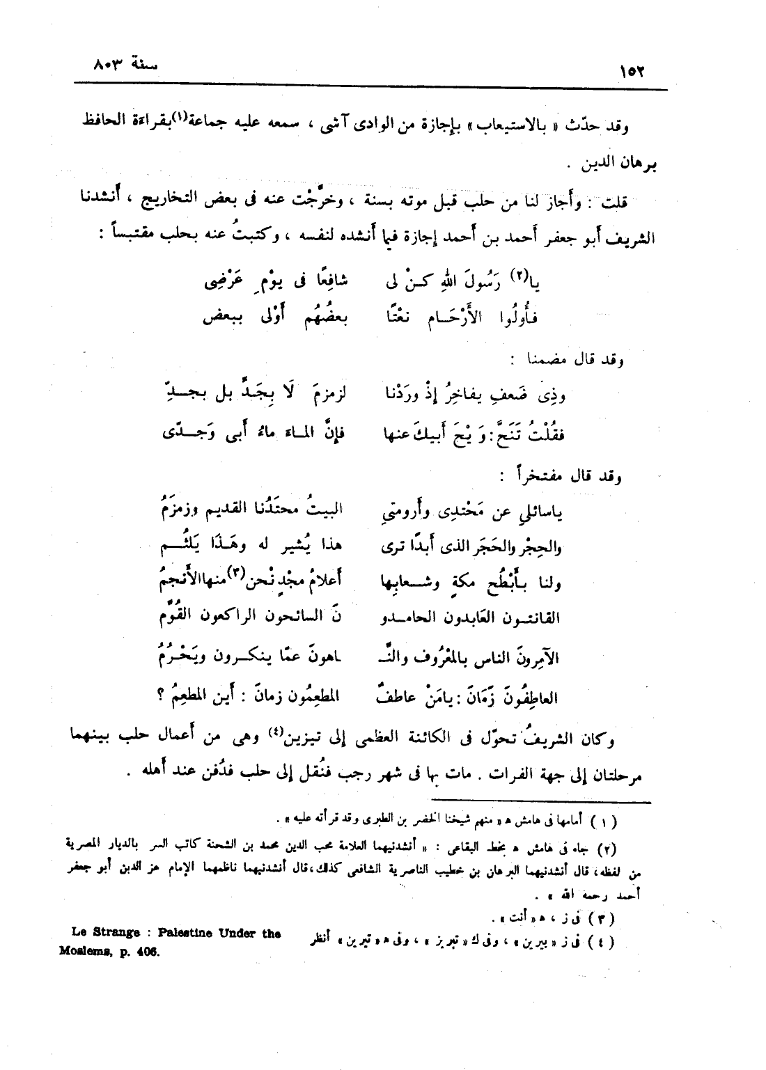 وقد حدث بالاستيعاب بإجازته من الوادي آشي سمعه عليه جماعى منهم شيخنا الخضر بن المصري وقد قرأته عليه بقراءة الحافظ برهان الدين، قلت: وأجاز لنا من حلب قبل موته بسنة وخرجت عنه في بعض التخاريج أنشدنا الشريف أبو جعفر بن أحمد إجازة فيما أنشده لنفسه وكتب عنه بحلب مقتبساً: