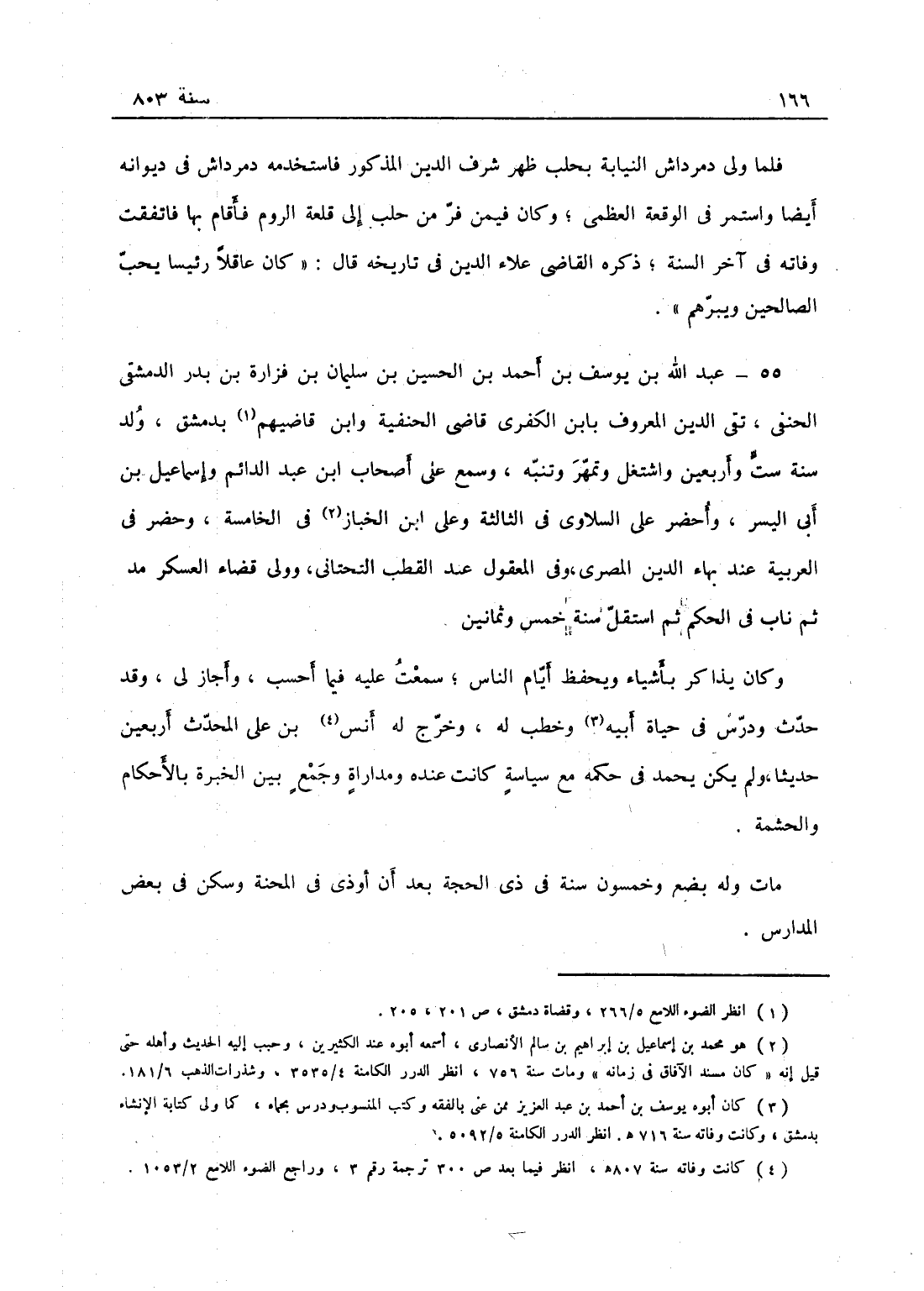 فلما ولي دمرداش النيابة بحلب ظهر شرف الدين المذكور فاستخدمه دمرداش في ديوانه أيضاً واستمر إلى الوقعة العظمى وكان فيمن فر من حلب إلى قلعة الروم فأقام بها فاتفقت وفاته في آخر السنة، ذكره القاضي علاء الدين في تاريخه وقال: كان عاقلاً رئيساً يحب الصالحين ويبرهم.