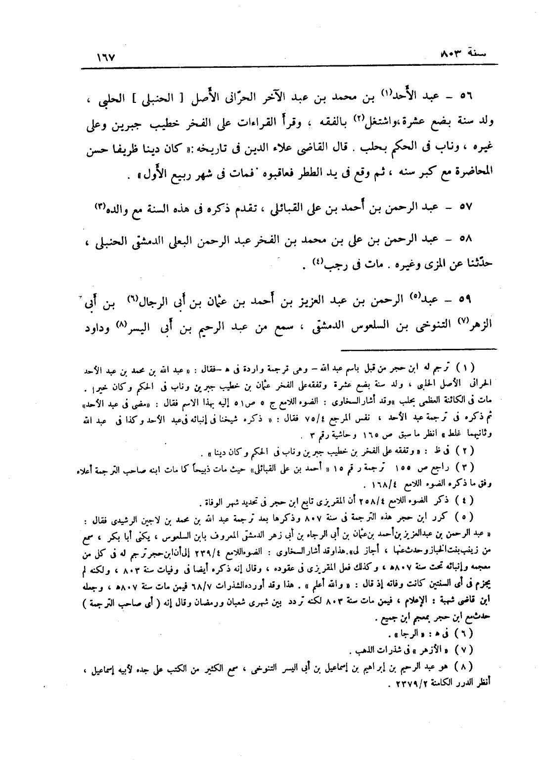 عبد الأحد بن محمد بن عبد الأحد الحراني الأصل الحلبي ولد سنة بضع عشرة واشتغل بالفقه وقرأ القراآت على الفخر خطيب جبرين وعلى غيره وناب في الحكم بحلب، وقال القاضي علاء الدين في تاريخه: كان ديناً ظريفاً حسن المحاضرة مع كبرسنه، ثم وقع في يد الططر فعاقبوه فمات في شهر ربيع الأول.