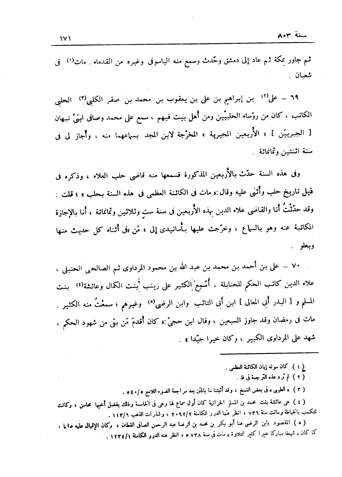 علي بن إبراهيم بن علي بن علي بن يعقوب بن محمد بن صقر الكلبي الكاتب كان من روؤساء الحلبيين ومن أهل بيت فيهم، سمع على محمد وصافي ابني نبهان الأربعين المخرجة لابن المحبر؟ بسماعهما منه، وأجاز لي في سنة اثنتين وثمانمائة، وفي هذه السنة حدث بالأربعين المذكورة فسمعها منه قاضي حلب العلائي وذكره في ذيل تاريخ حلب وأثنى عليه وقال: مات في الكائنة العظمى في هذه السنة بحلب، قلت: وقد حدثت أنا والقاضي علاء الدين بهذه الأربعين في سنة ست وثلاثين وثمانمائة أنا بالإجاوة والمكاتبة عنه وهو بالسماع وخرجت عليها بأسانيدي إلى من في أثناء كل حديث منها وبعلو.