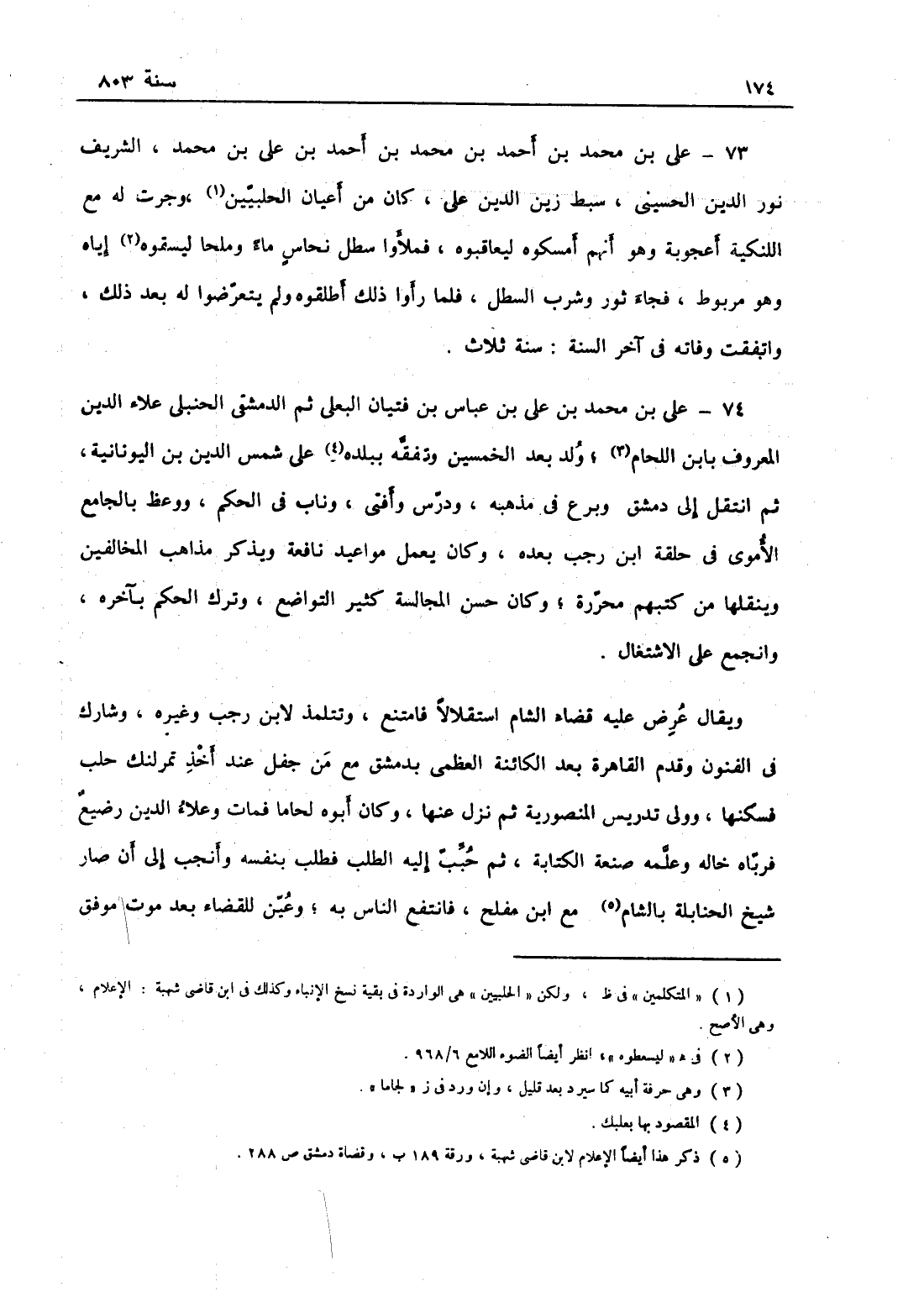علي بن محمد بن علي بن عباس بن فتيان البعلي ثم الدمشقي الحنبلي علاء الدين المعروف بابن اللحام ولد بعد الخمسين وتفقه ببلده على شمس الدين ابن اليونانية ثم انتقل إلى دمشق وبرع في مذهبه ودرس وأفتى وناب في الحكم ووعظ بالجامع الأموي في حلقة ابن رجب بعده وكان يعمل مواعيد نافعة ويذكر مذاهب المخالفين وينقلها من كتبهم محررة، وكان حسن المجالسة كثير التواضع، وترك الحكم بأخره وانجمع على الاشتغال ويقال عرض عليه قضاء الشام استقلالاً فامتنع، وتلمذ لابن رجب وغيره وشارك في الفنون وقدم القاهرة بعد الكائنة العظمى بدمشق مع من جفل عند أخذ تمرلنك حلب فسكنها وولي تدريس المنصورية ثم نزل عنها وكان أبوه لحاماً فمات وعلاء الدين رضيع فرباه خاله وعلمه صنعة الكتابة ثم حبب إليه الطلب فطلب بنفسه وأنجب إلى أن صار شيخ الحنابلة بالشام مع ابن مفلح فانتفع الناس به، وعين للقضاء بعد موت موفق