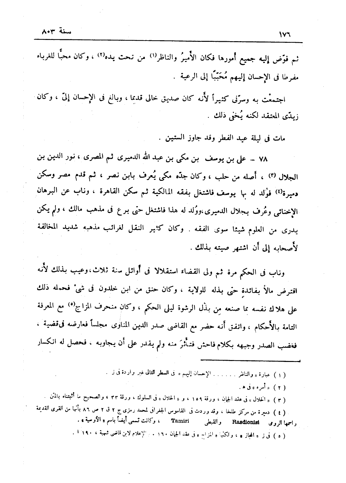 علي بن يوسف بن مكي بن عبد الله الدميري ثم المصري نور الدين ابن الجلال أصله من حلب وكان جده مكي يعرف بابن نصر ثم قدم مصر وسكن دميرة فولد له بها يوسف فاشتغل بفقه المالكية، ثم سكن القاهرة وناب عن البرهان الأخناي وعرف بجلال الدميري وولد له هذا فاشتغل حتى برع في مذهب مالك ولم يكن يدري من العلوم شيئاً سوى الفقه وكان كثير النقل لغرائب مذهبه شديد المخالفة لأصحابه إلى أن اشتهر صيته بذلك، وناب في الحكم مدة ثم ولي القضاء استقلالاً في أوائل سنة ثلاث وعيب، بذلك لأنه اقترض مالاً بفائدة حتى بذله للولاية وكان حنق من ابن خلدون في شيء فحمله ذلك على هلاك نفسه بما صنعه من بذل الرشوة ليلي الحكم، وكان منحرف المزاج مع المعرفة التامة بالأحكام فاتفق أنه حضر مع القاضي صدر الدين المناوي مجلساً فعرضه في قضية فغضب الصدر وكلمه بكلام فاحش فتأثر منه ولم يقدر على أن يجاوبه فحصل له انكسار