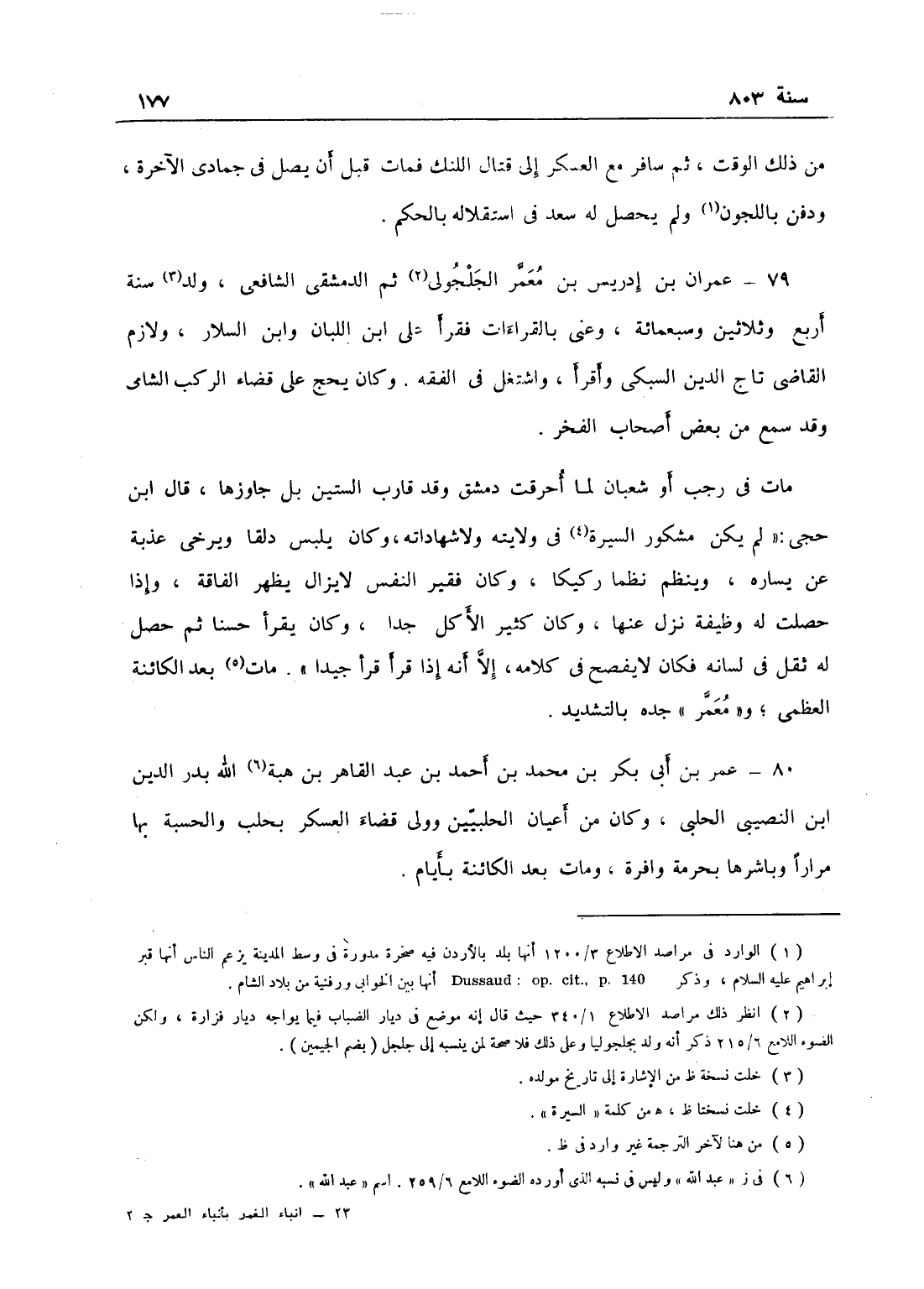 عمران بن أدريس بن معمر الجلجولي ثم الدمشقي الشافعي ولد سنة أربع وثلاثين وسبعمائة، وعني بالقراآت فقرأ على ابن اللبان وابن السلار ولازم القاضي تاج الدين السبكي وقرأ، وحصل له في لسانه ثقل فكان لا يفصح بالكلام إلا إذا قرأ فإنه يقرأ جيداً، واشتغل في الفقه، وكان يحج على قضاء الركب الشامي، وقد سمع من بعض أصحاب الفخر؛ مات في رجب أو شعبان لما أخرجت وقد قارب الستين بل جاوزها؛ قال ابن حجي: لم يكن مشكوراً في ولاياته ولا شهاداته، وكان يلبس دلقاً ويرخي عذبة عن يساره وينظم نظماً ركيكاً، وكان فقير النفس لا يزال يظهر الفاقة وإذا حصلت له وظيفة نزل عنها، وكان كثير الأكل جداً، وكان يقرأ حسناً؛ مات بعد الكائنة العظمى ومعمر جده " بالتشديد ".
